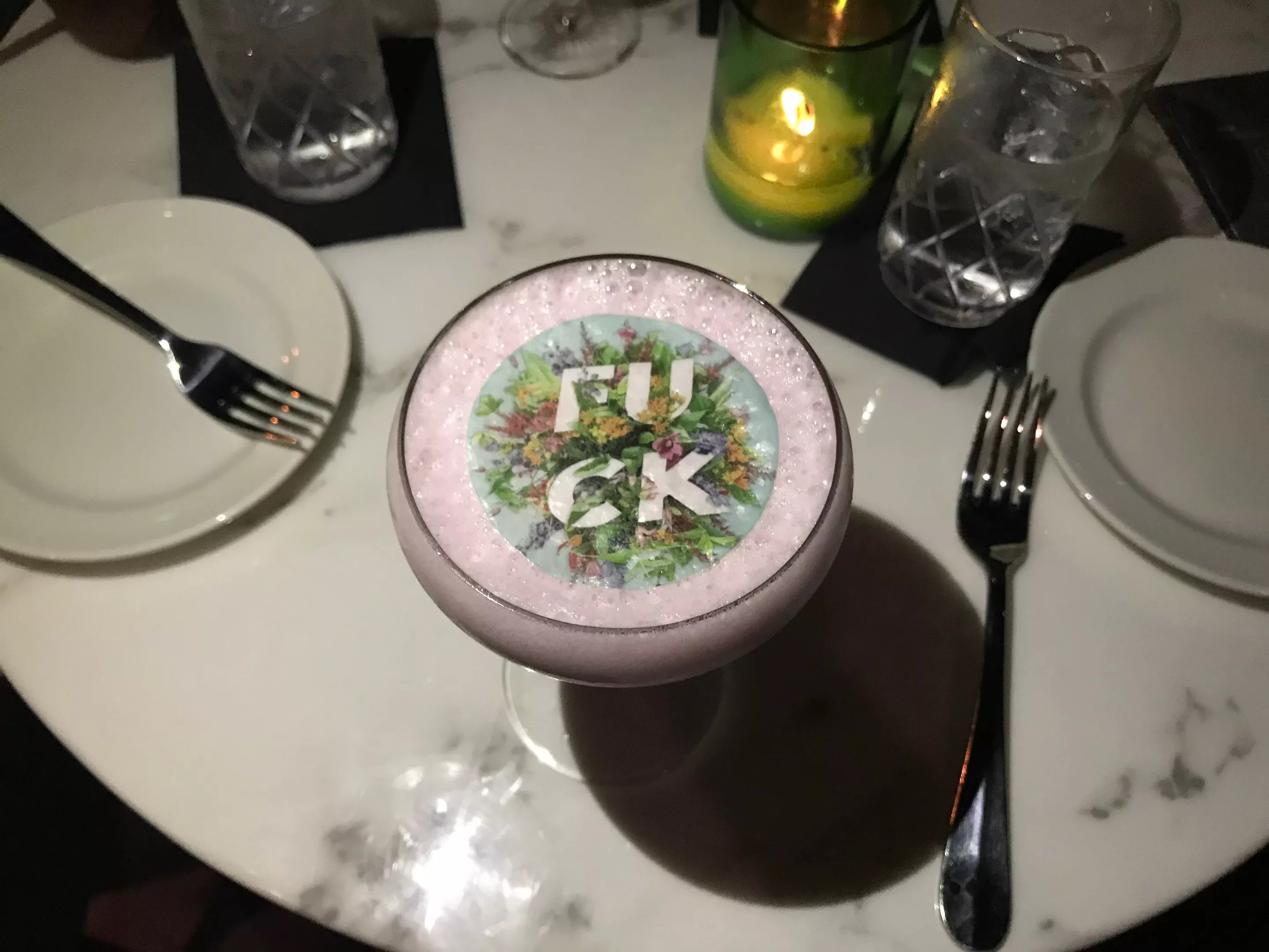 The Ivy League, made with Reyka vodka, blackberry, tarragon, Grand Poppy and egg white, arrives in coupe glass and has a pink hue and characteristic foam on top thanks to the egg white. Floating atop that foam: a circular piece of wafer paper that reads “FUCK.” The bar creates the garnish by printing the design onto a wafer using the same technology that cake designers use.