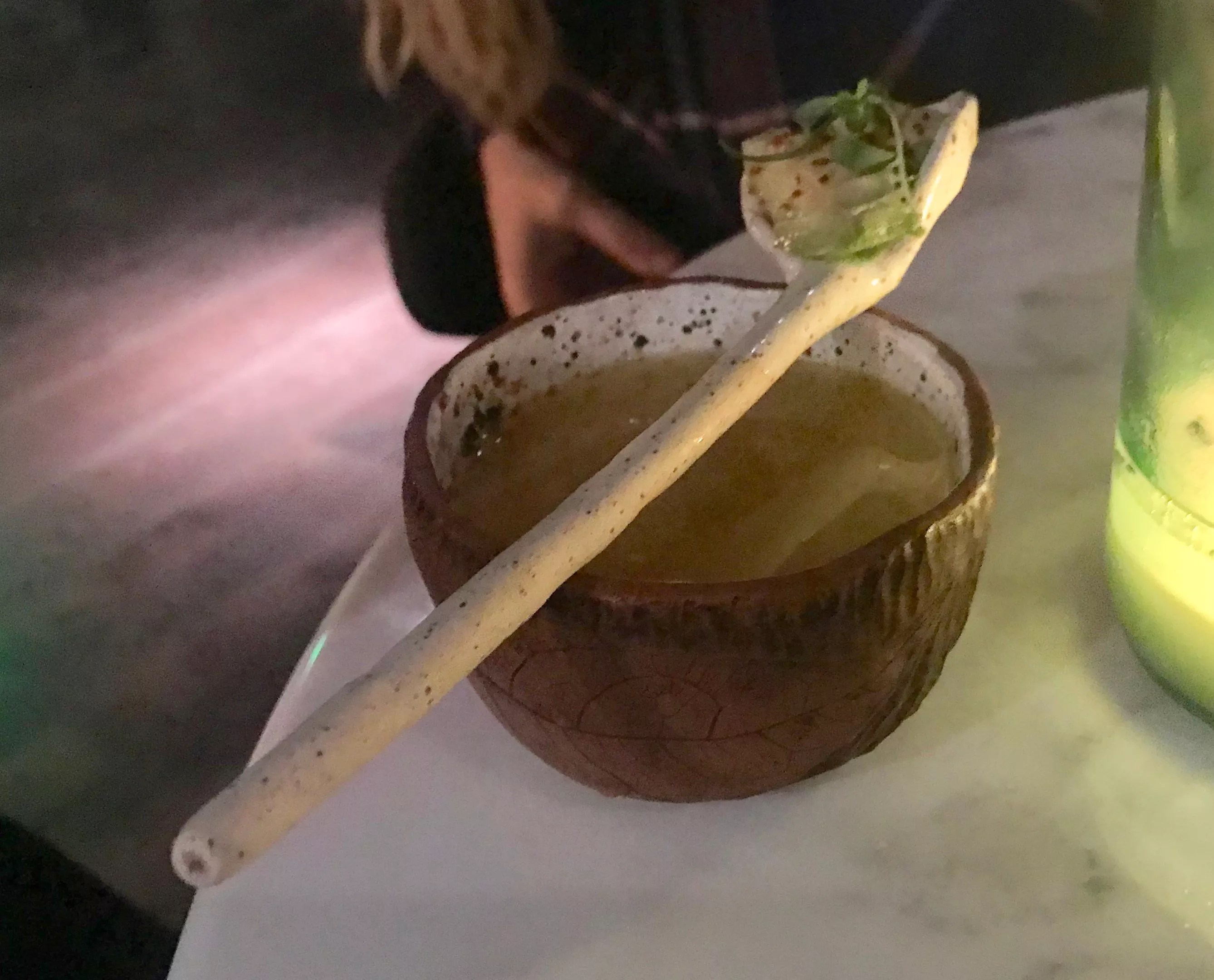 The Bob, a Wild Turkey cocktail, arrives inside a heavy, ornate metal teapot, dry ice spewing fog out of the pot. You sip it from an equally heavy-duty metal tea cup. The Rattail, made with turmeric, Suze, tequila and mezcal, comes in what looks like a hand-thrown clay cup garnished with a clay spoon with a bite of avocado, espelette pepper and micro cilantro.