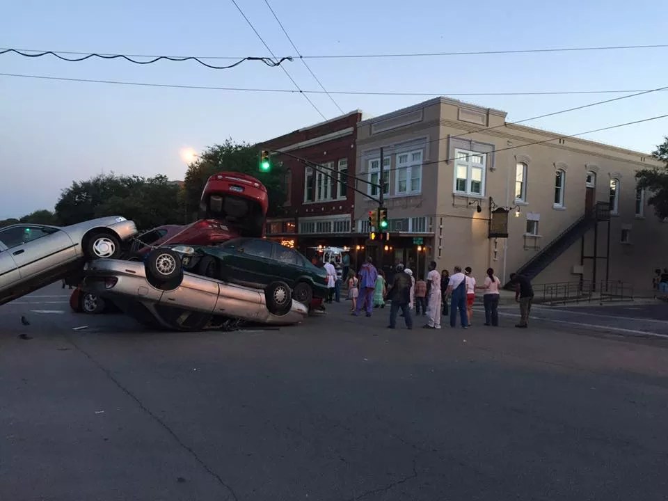 Cars pile up in downtown Corsicana as part of a scene in apocalypse comedy FAZ.