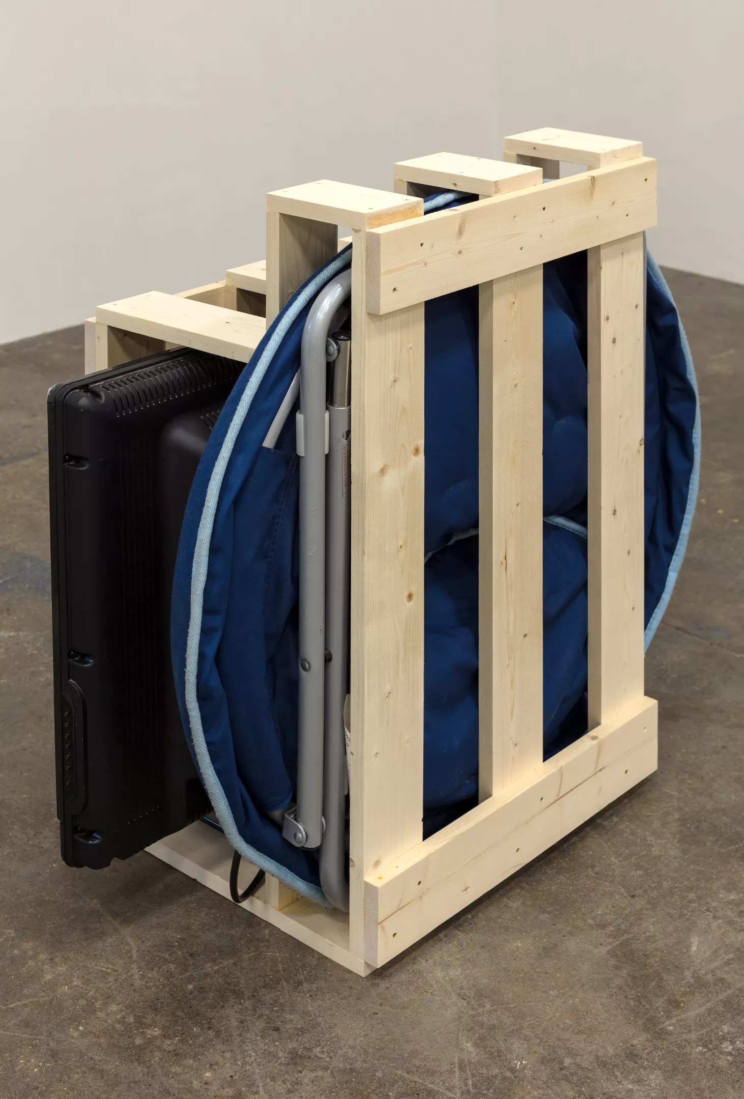 All of the works date from the early 2000s or earlier, except for two sculptural works Schwarz created for this show. One is an assemblage piece consisting of a small television and a blue outdoor chair squeezed inside a wooden enclosure; the other is a small section of a white door that seems to be made out of a cardboard box.
