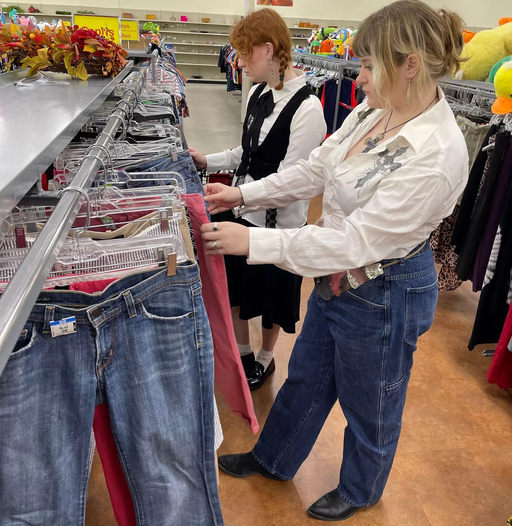 Check for additional sales and events to secure the bargain bag. Stores like Thrift Giant offer daily colorful tag discounts and additional sale days, but something many people miss out on is the store’s app, which offers a 25% off VIP member discount on Sundays. Many places will have options to sign up for email alerts/newsletters to stay informed. Thrift stores also offer military and senior discounts (Texas Thrift even has a senior day every Tuesday for 30% off purchases) and coupons for donations. Purging your clothing before you shop is also a great way to earn extra cash for shopping and maybe even a tax deduction; just make sure to ask for a receipt from the store. Loyalty rewards systems will also vary by area, so ask about the programs offered even if another store location isn’t having any. For example, the smaller Goodwill stores in towns like Lewisville may not offer the point systems that larger areas like Denton do. Sidney and Landry remind us to stretch the denim to test for dry rot. Erica Hotchkiss