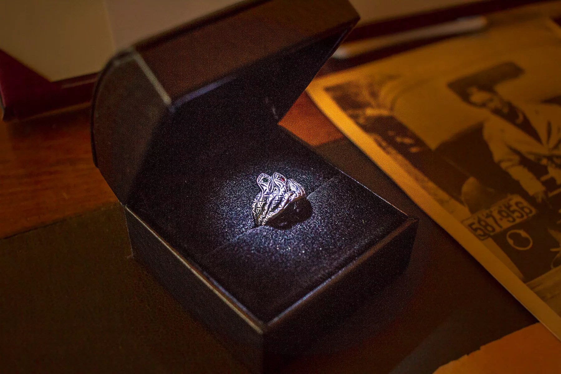 No one was quite sure what to make of this ring when it was first rediscovered, Livingston said. It came as part of the Schmid collection and was said to have been crafted by Clyde himself during a stint in prison before being gifted to Bonnie. “Because it’s coming right from the family we didn’t doubt the account, but how did she get it, how do we know it was Bonnie’s?” Livingston asked rhetorically. As it happened, Buddy was able to confirm Clyde made jewelry, since he has several of Clyde’s pieces in his own collection. He instantly recognized the ring – encrusted with three jewels on the heads of three snakes and bearing Clyde’s makers mark, a musical note pierced by an arrow – as his uncle’s handiwork. The ring was taken by Schmid after Bonnie and Clyde ditched their car following the foiled Sowers raid.