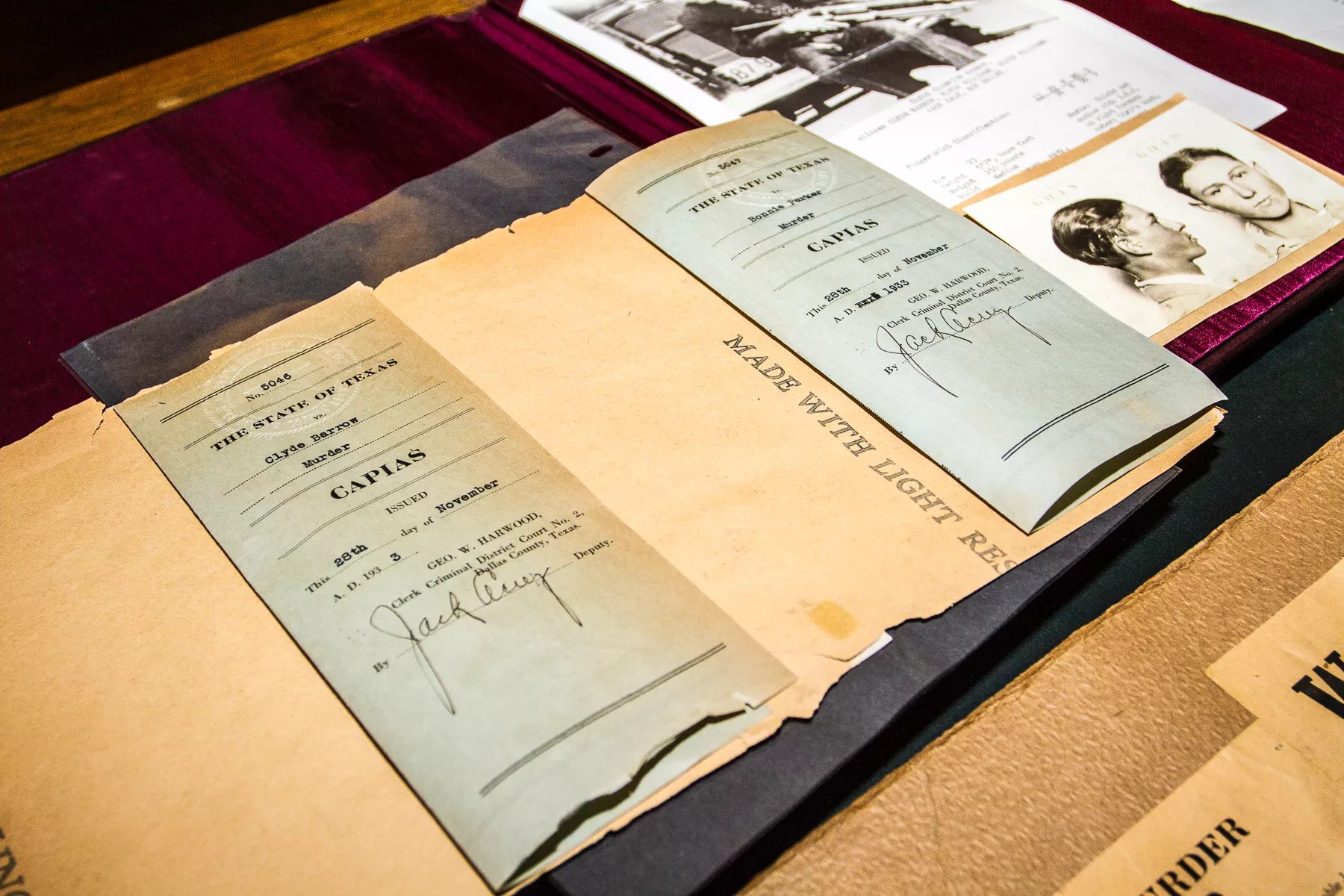 In Schmid’s scrapbook there are several pages such as this, with relics pertaining to Bonnie and Clyde pasted onto them, including the warrants for their arrest. The warrants were issued by Dallas County Sheriff Schmid on Nov. 28, 1933, six days after a failed ambush in Sowers, Texas. The charge of murder was levied against Clyde, and for the first time Bonnie, after a Dallas grand jury indicted them for the murder of Tarrant County Deputy Malcom Davis in January of that year. Davis and a group of deputies had been staking out the house of Lillie McBride, sister of Barrow gang member Raymond Hamilton, when Clyde walked up to the porch sometime after midnight. As the trap was sprung, Clyde fired a blast from a shotgun, killing Davis before escaping into the night.