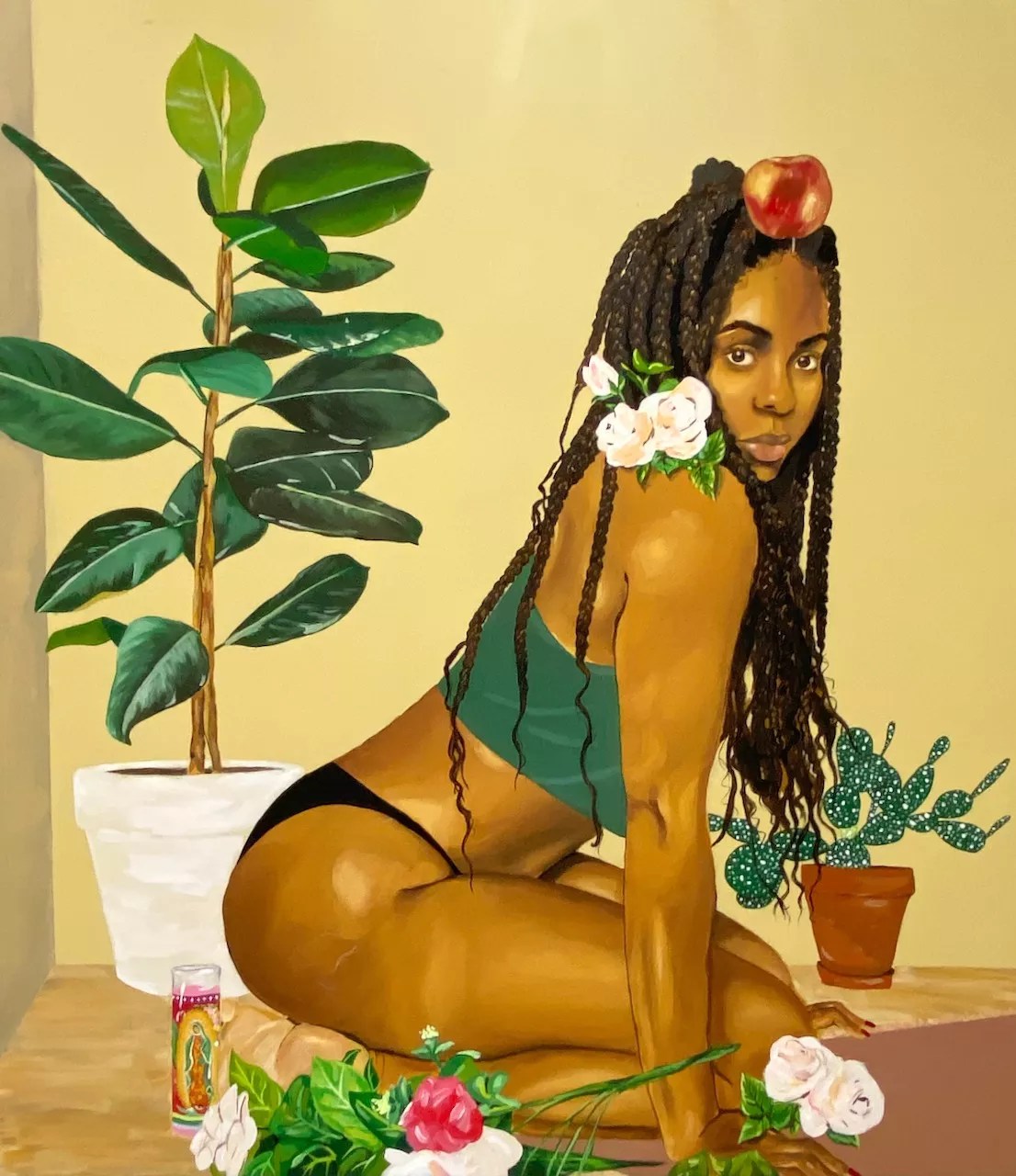 From Ari Brielle’s website: “Going to vigils over the years and seeing flowers, fruit, photos, and candles set up as altars to honor those whose lives had been taken at the hands of police, I began to think of the Black femme body as an altar. I am an altar.” Brielle used gouache and acrylic for these pieces creating up-close details that are as captivating as zoomed-out symbolism. The strength felt in Altar is as intimidating as it is inviting.