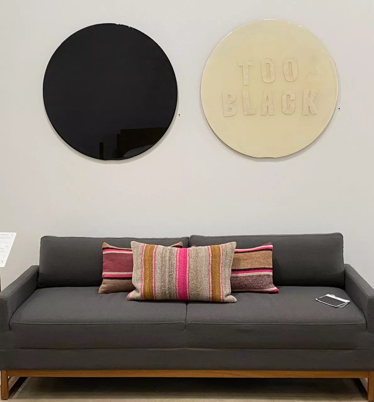 Molly Margaret Sydnor is a fabric and textile artist whose work was showcased at Sweet Tooth Hotel last year. Her theme for this show reflects her struggle to reconcile her own identity; while her mother is white, her father is the direct descendant of enslaved people, leaving her to jostle with a mix of identities; a prevalent theme in her work. Her textiles line the front room; further back, two pieces read “NOT WHITE” and “TOO BLACK.” Both have a glossy overcoat, giving the work the unintended consequence of self-reflection, a quality Sydnor says aligns perfectly with the message.
