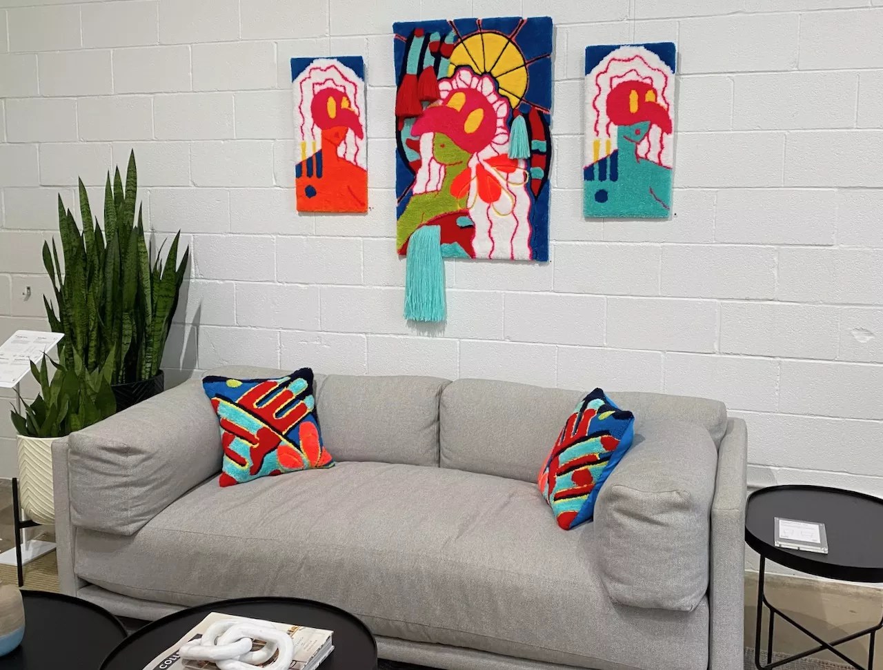 One of Dallas’ undisputed favorite hip-hop artists, Sam Lao is also a successful painter and textile artist. In March she told us, “Making has no limits for me. I make what I want as the desire and idea strikes me, and it’s wonderful when it resonates with others.” Her wall rugs at {neighborhood} are titled “Muse” and “The Watcher.” Initially, her work was intended to be a nod to plague masks of the past and to our own modern-day plague. “However, the figures in my work that wear them represent muses, the physical embodiment of inspiration, of an idea,” Lao says. “The intersection of these two seemingly opposing images represents both life and death, how an idea can be infectious and all-consuming, how it could die with you if you take no action or leave a lasting impression even after you’re gone.”