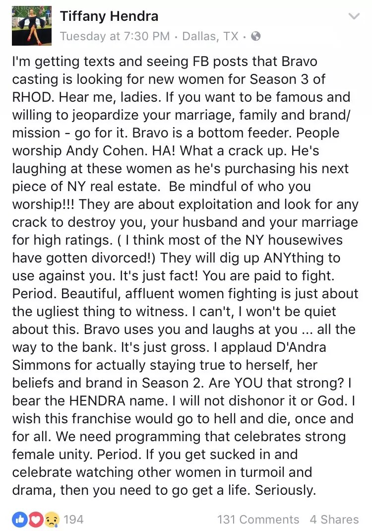 A Facebook post by former Housewife Tiffany Hendra made its way around the internet Monday. In the post, Hendra warns women against going on the show. She also calls out Housewives executive producer Andy Cohen for pitting women against one another and profiting from it.