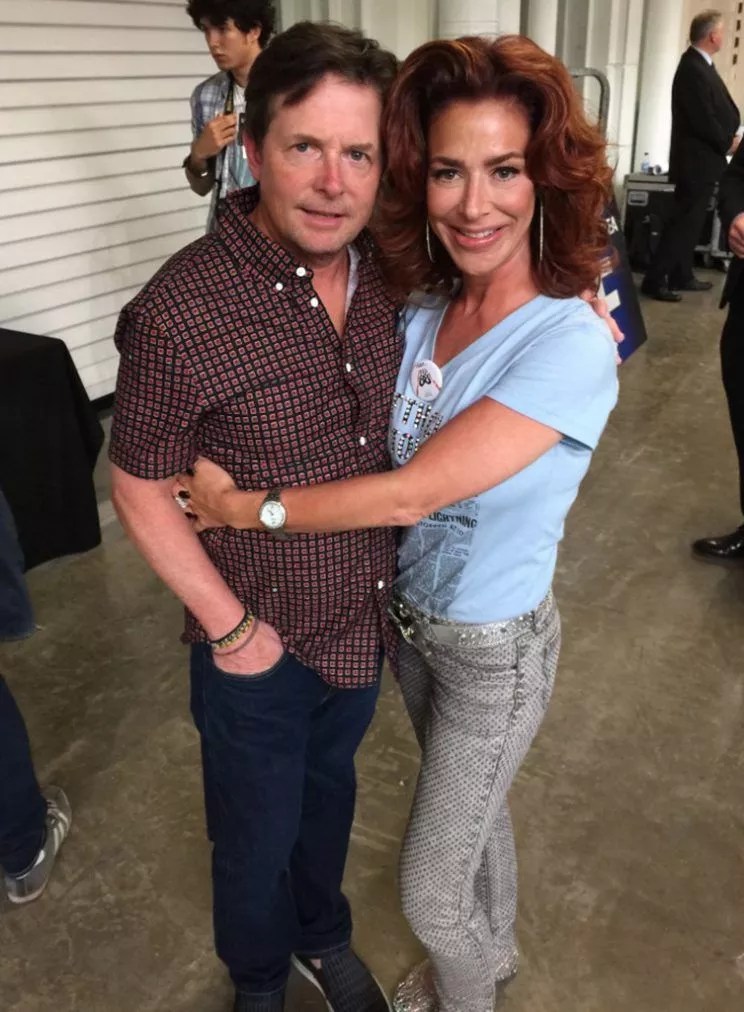 Actress Claudia Wells poses for a picture with Michael J. Fox, who co-starred opposite her in the classic comedy Back to the Future.