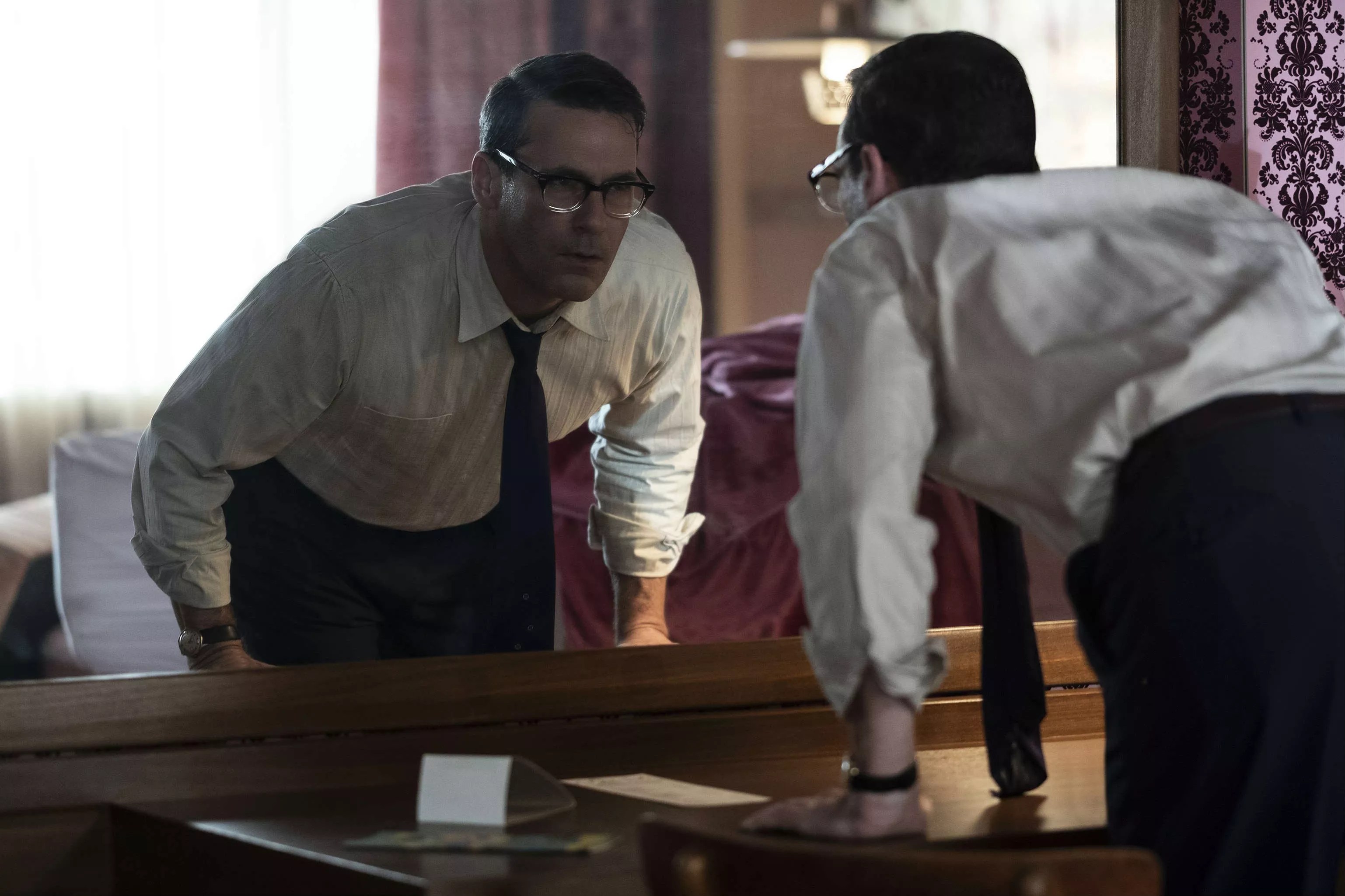 Turns out, most of these people aren’t who they seem. Neither is Dakota Johnson’s character, a swearing woman with a sports car who barges in and jolts the movie. And neither is the hotel – that’s where things get good. After the lengthy introductions, Goddard starts picking his people apart, letting us observe their odd behavior and try to make sense of it. Who is here for the bag in the floor? Why does a vacuum cleaner salesman pick apart his room’s rotary phone while calling his wife and kids? What’s haunting the singer, and why is she eager for a room away from everyone else? And why does each room have so expansive a mirror, besides the fancy of the director, who loves catching his cast’s reflections? The answer to that last one is little surprise, especially if you’ve seen Cabin in the Woods, and the scenes here of Hamm’s character discovering the answer find Goddard at his most sly and enticing. The camera tracks beside him as, awed and horrified, the salesman gets glimpses of everyone else’s secrets.