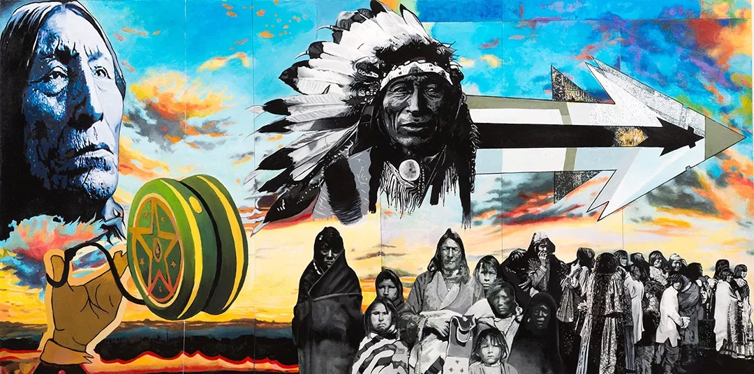 The collection is a catalog of what he says has defined American history, and reflects major historic events with their contemporary counterparts. One piece draws on moments such as Native American on the Trail of Tears, related to the current government’s executive order to advance construction of the Dakota Access Pipeline.