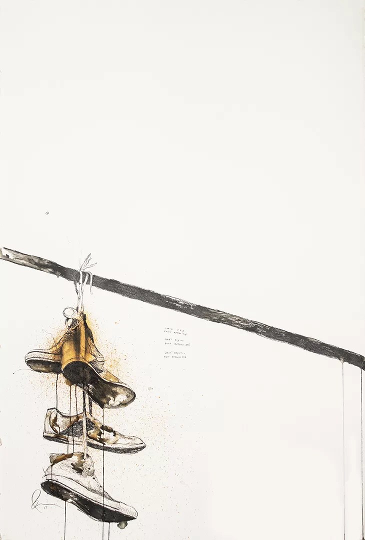 The installation is composed of speakers playing a multi-channel sound collage created by the artist, and criss-crossing wires stretched along the gallery ceiling with shoes thrown over. According to Pecou’s description, it’s an allegory for overcoming and escaping limitations, both assumed and implied.