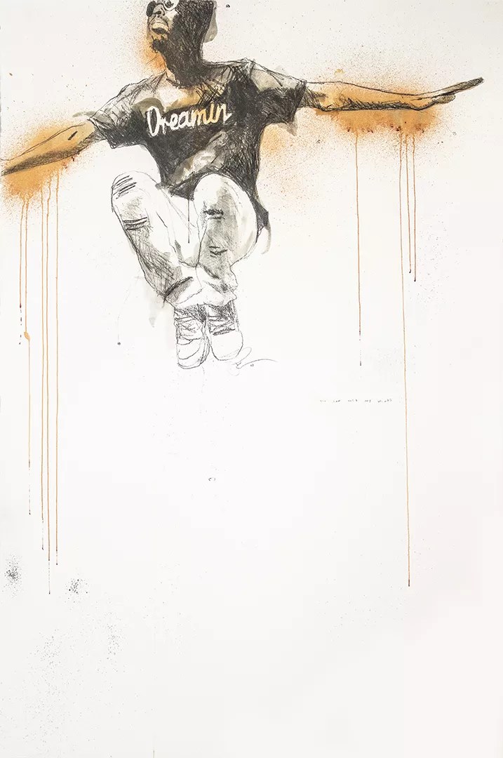 is an exhibit by Atlanta-based artist Fahamu Pecou. The large-scale drawings, along with an installation titled Flight School, are a means to inspire imaginations, dreams and hopes within the black male community — one which, according to the artist’s description, is conflated with despair and hardships.