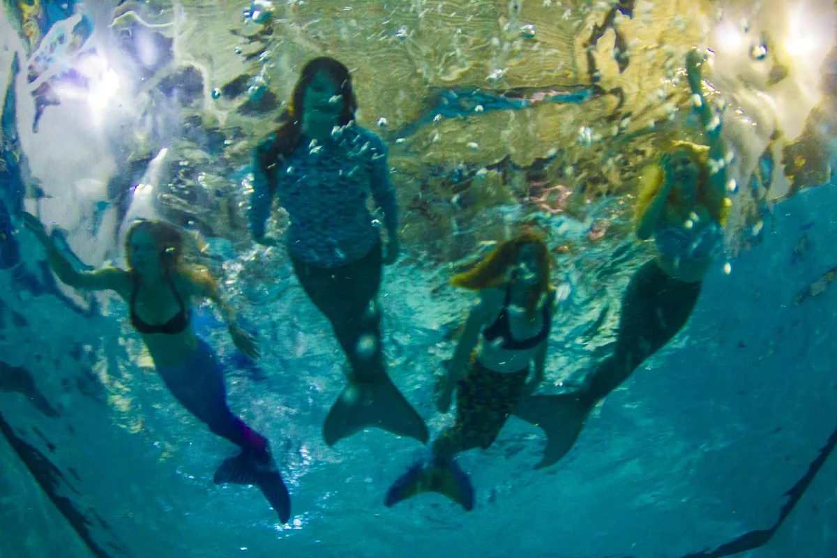 Dobbs (second from left) swims with mermaids at the Adventure Scuba and Snorkeling Center in Plano.