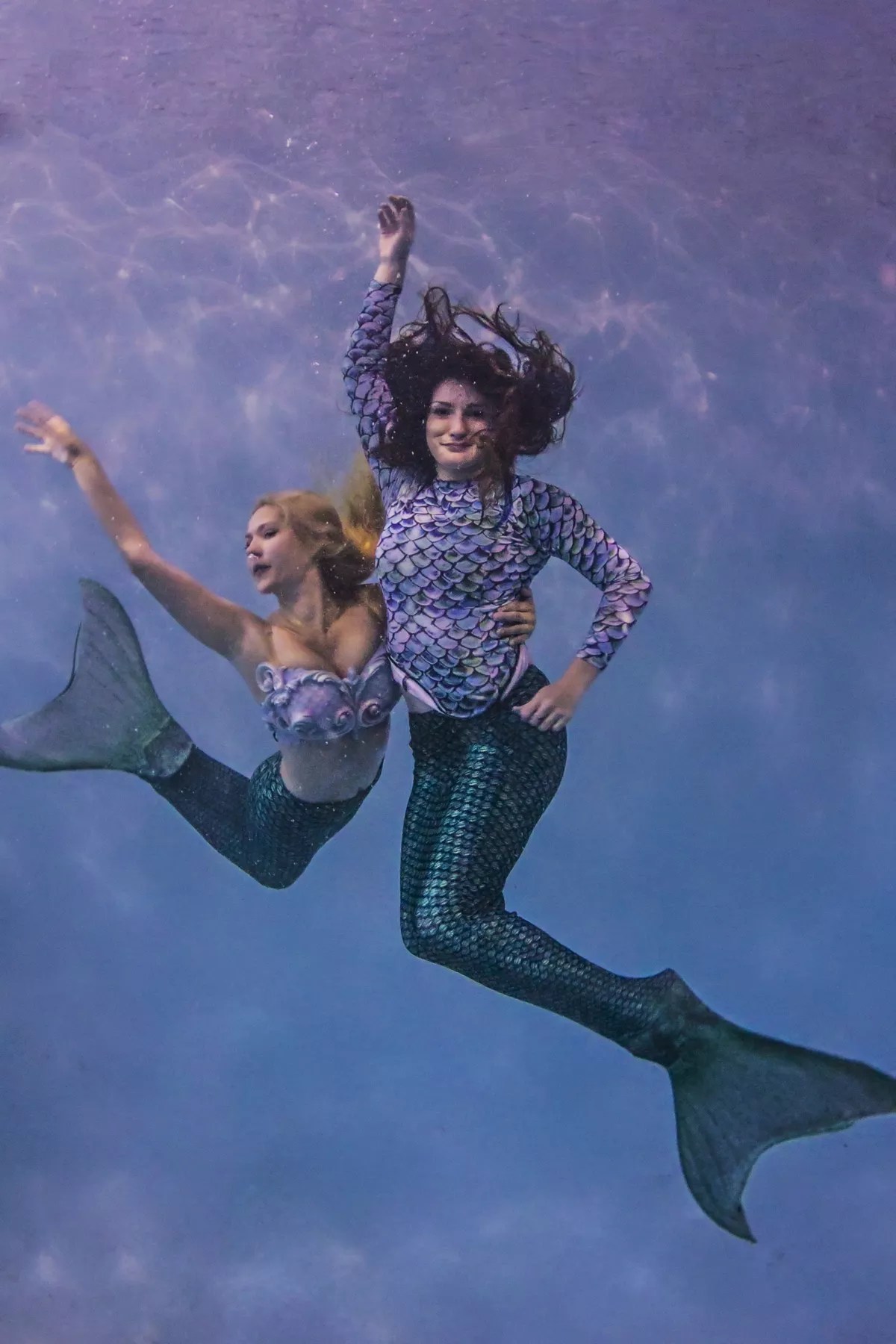 Dobbs (right) poses underwater with fellow mermaid, Ashton Larson.