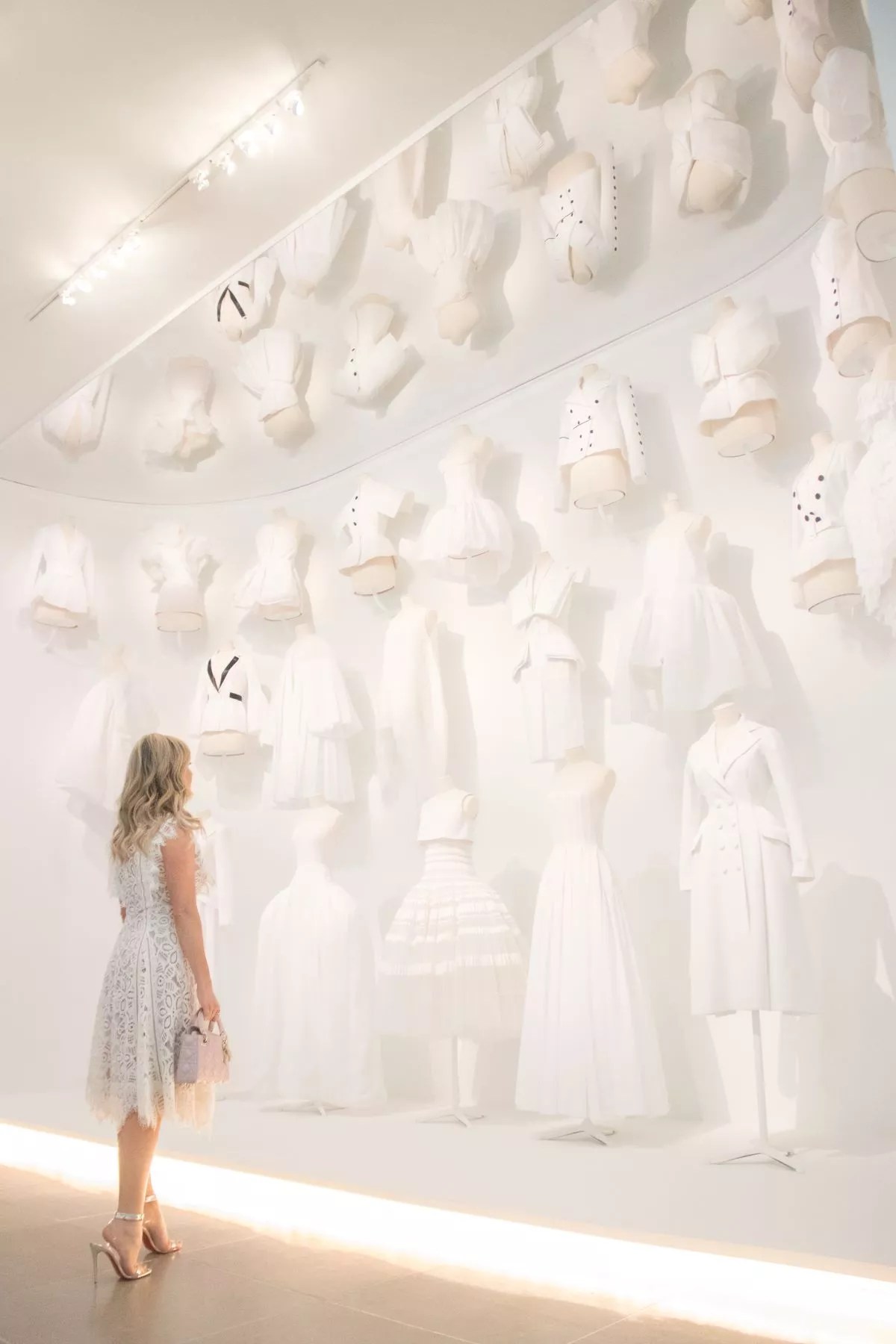 A row of white garments in the dazzling Dior retrospective at the DMA