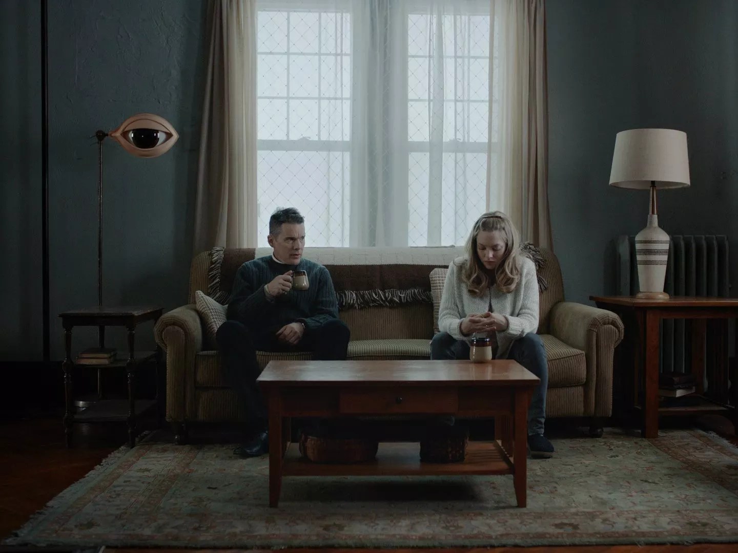 Ethan Hawke (left) plays Ernst Toller, a preacher losing his faith in his institution, and Amanda Seyfried is Mary, a pregnant parishioner who shakes off existential dread and soldiers on, in Paul Schrader