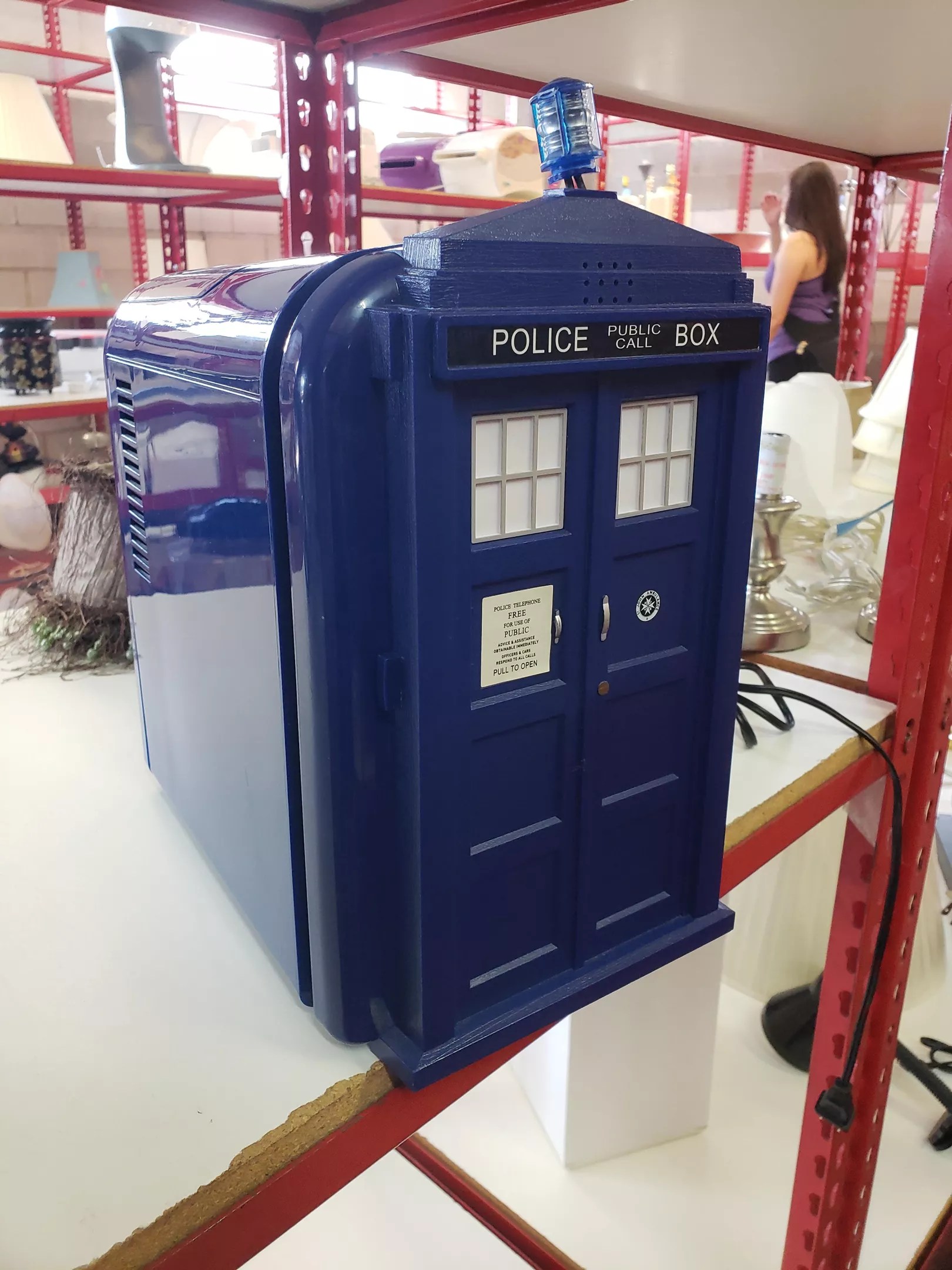 Do you like Doctor Who? Do you have a very small quantity of beverages that you’d like to keep cold? Do you wish your household appliances were more discreet? We have the perfect mini fridge for you. This looks like a Tardis, makes goofy sounds opening and holds six cans.