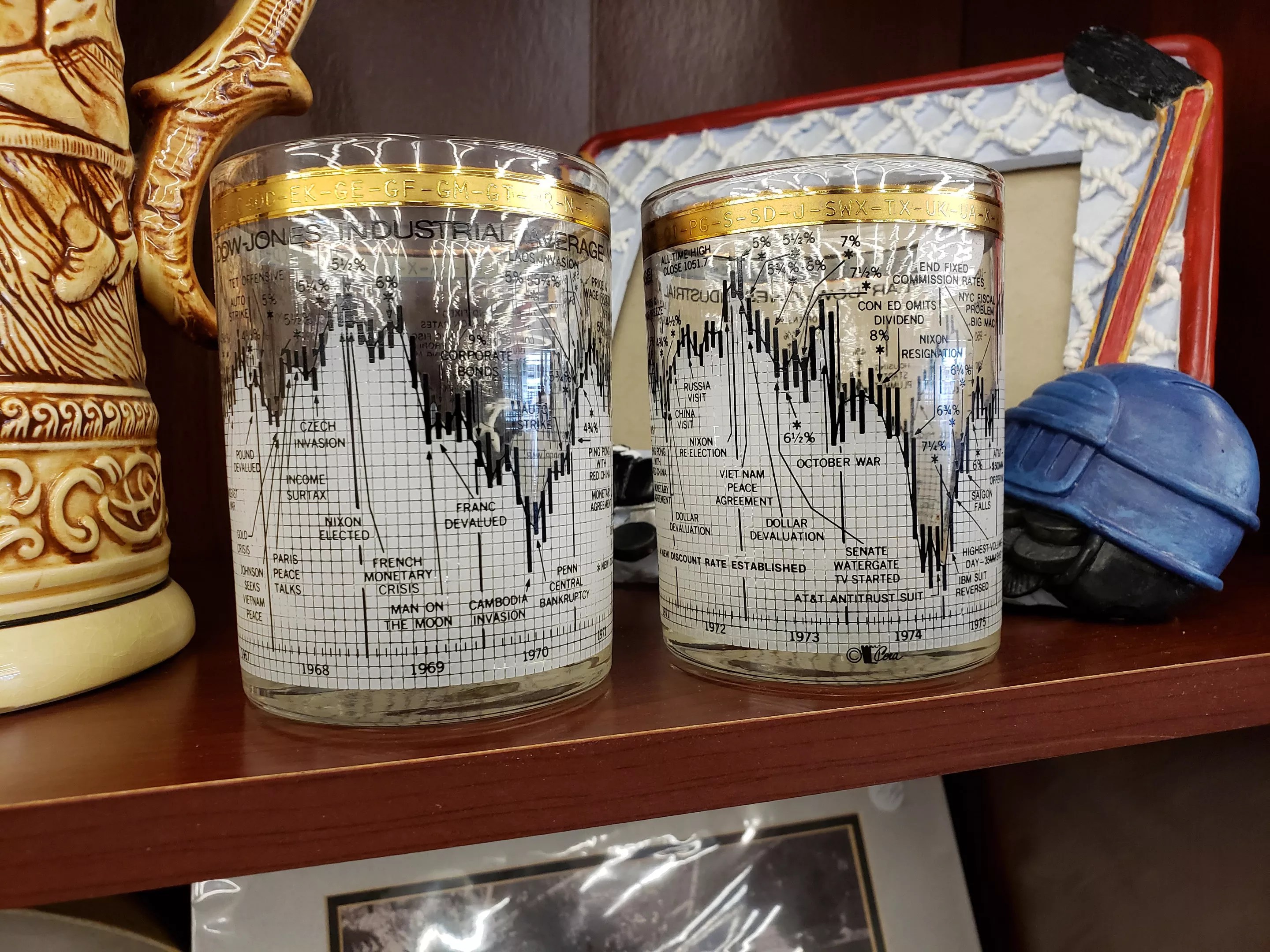 Kamala Harris may have been right when she said most Americans don’t own stock, but you can at least quell your feelings of financial insecurity by drinking from these cocktail glasses decorated with the 15-Year Dow Jones Industrial Average.
