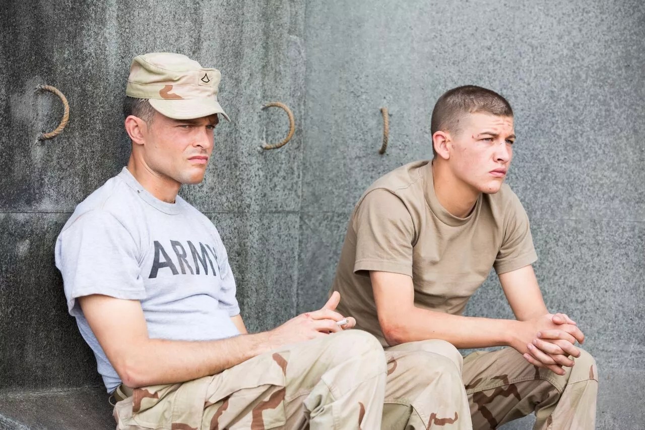 Alden Ehrenreich (left) plays Bartle and Tye Sheridan is Murphy in The Yellow Birds, Alexandre Moors