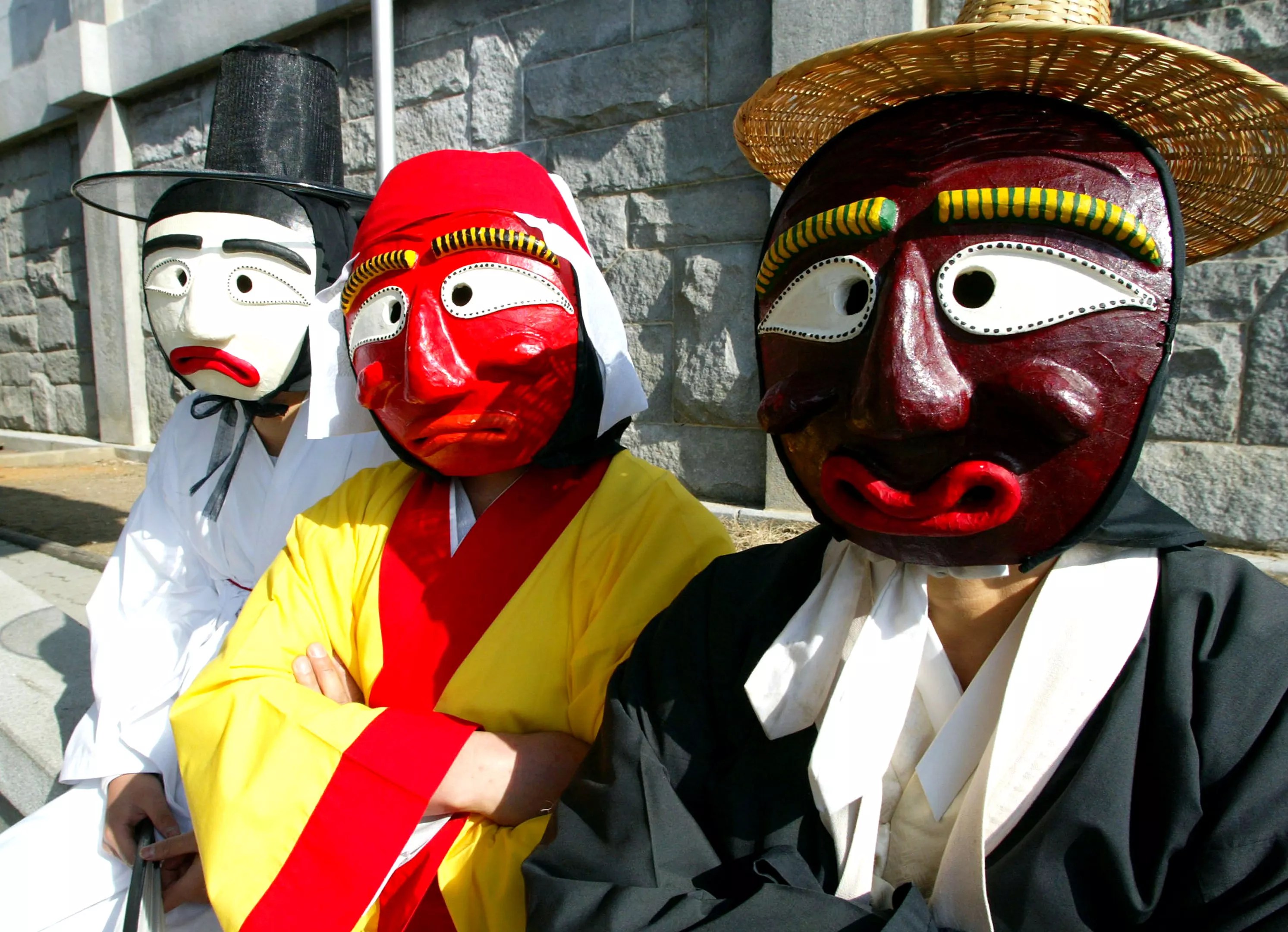 South Korean dancers at a folk art festival in Seoul. Masked dancers are one of the attractions at the Korean Festival this week.