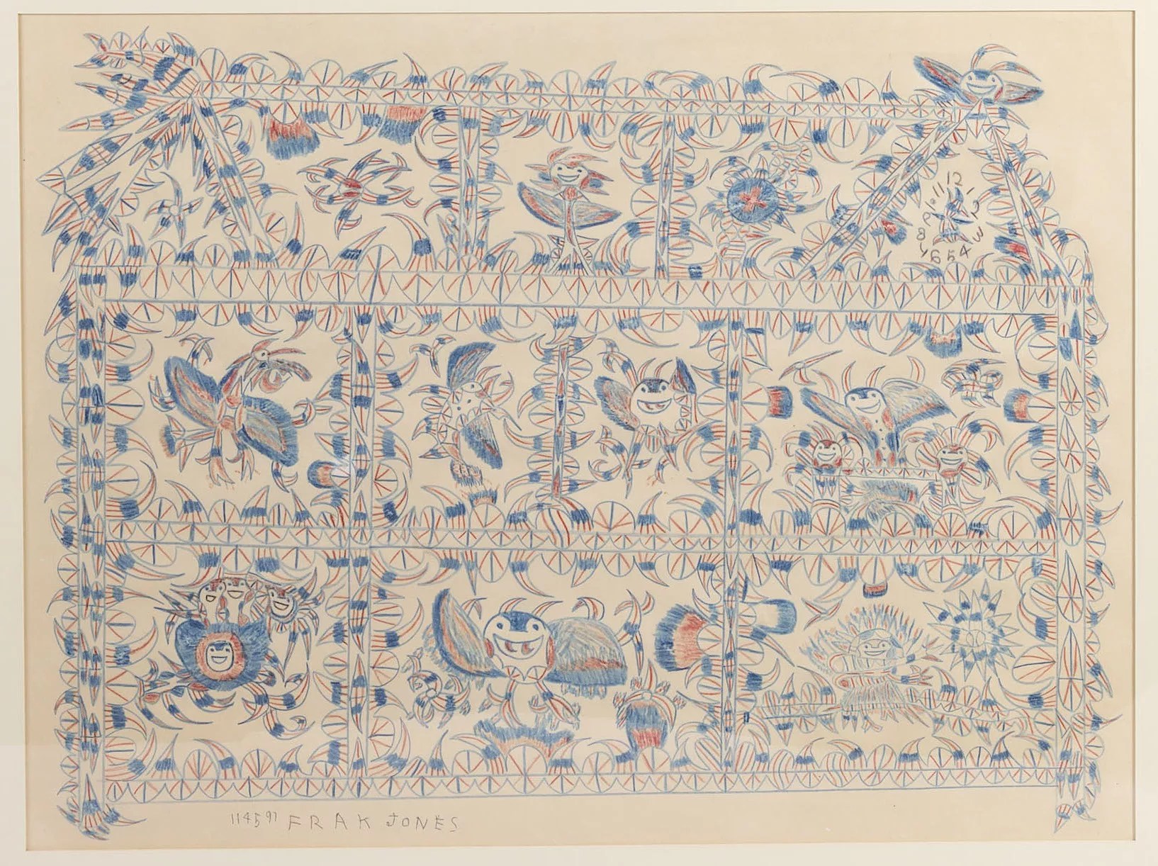 Jones started making paintings late in life – he was in his 60s, and the drawings represented what he saw in both his tangible and supernatural worlds. By drawing the devils inside the grid system, which was reminiscent of a prison cell block, “he was able to contain their powers over him,” says Wehnert.