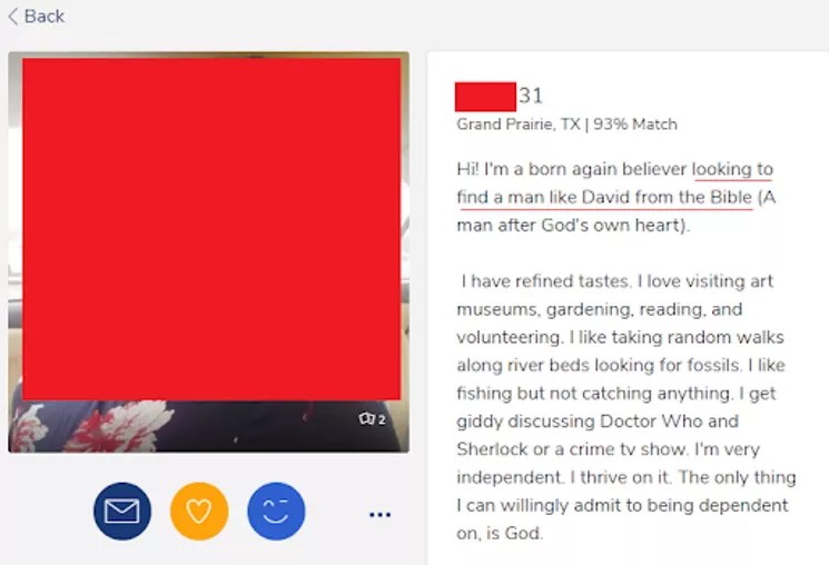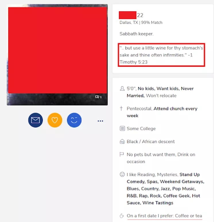 I went undercover with the name “Eric Lynn Wright,” which was Eazy-E’s legal name (my middle name is also “Lynn,” and our first names kind of rhyme). I tried to get a sense of members of both sexes, but that would require me to say that I’m bisexual. Doing that didn’t seem tactful since it’s a Christian website, but more important, I’m straight, and there’s something about posing as a bisexual person even under an alias that felt wrong.