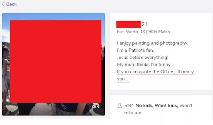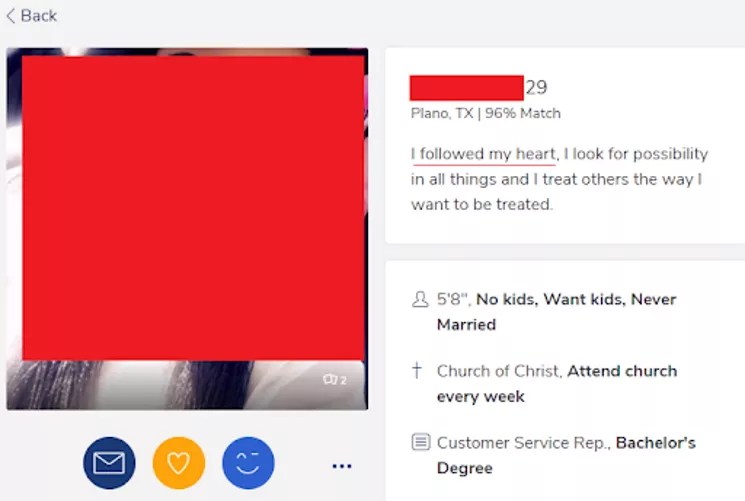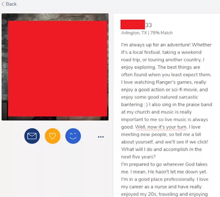 With what little tools I had, I created and honed my character. I thought about using pictures of an Urban Outfitters model, but I didn’t want to risk any legal trouble. I also thought about asking my more attractive friends if I could use their pictures, but it didn’t feel right dragging them into this whole charade. So I reluctantly decided to use my own photos, hoping I wouldn’t come across someone I know. I made my Eric Lynn Wright character a property claims adjuster, and even though I am affiliated with the Churches of Christ, non-denominational seemed more likely to get me matches, so I went with that.