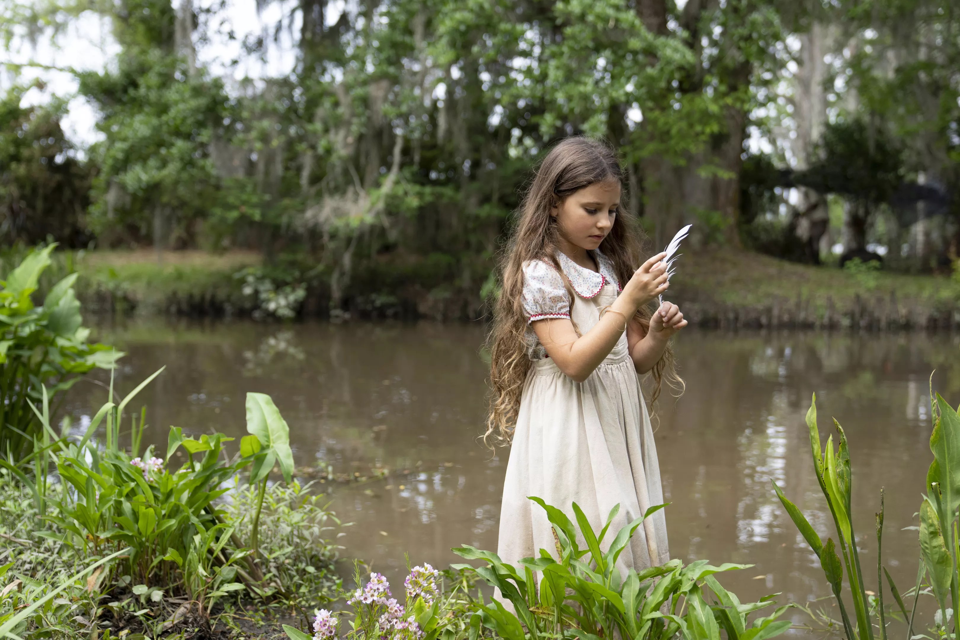 Without proper guardianship, Kya is soon forced to fend for herself as she navigates getting groceries, collecting and identifying shells and feathers, and attending school. On her first day of school, Kya arrives wearing her mother’s old, tattered dress, covered in mud. According to Regina, this particular scene took the longest in terms of make-up and costume prep. “My feet and hands had to have just the right amount of dirt and mud,” she explains.
