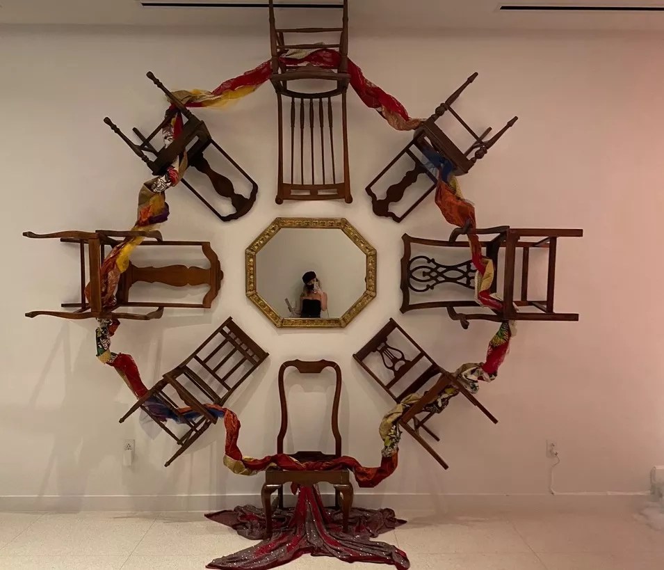 “I’ll Never Tell” from Outloud allows visitors to walk up steps full of vintage furniture and take pictures with a retro phone that speaks to you when you pick it up. The final installation by Chloe Curiel x Iam450, “Seated Together,” includes a gravity-defying installation of vintage chairs and classic fabrics arranged in a geometric design that extends nearly to the ceiling.