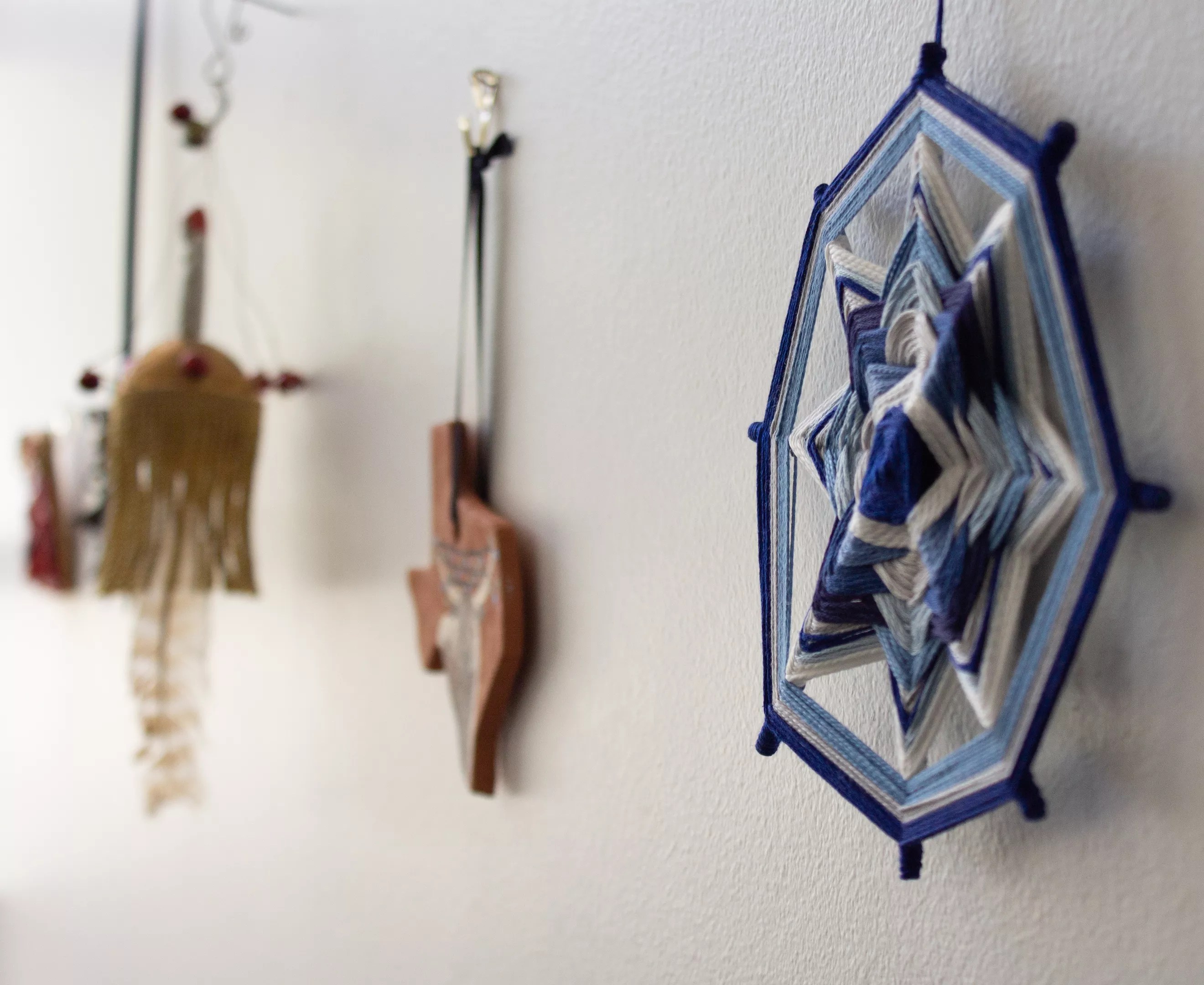 The New Blue Yule features Sharon Shero’s “Shake a Tail Feather,” Tori Solis’ “Untitled (Longhorn)” and Sally Ackerman’s “Untitled (Blue Mandala)”.