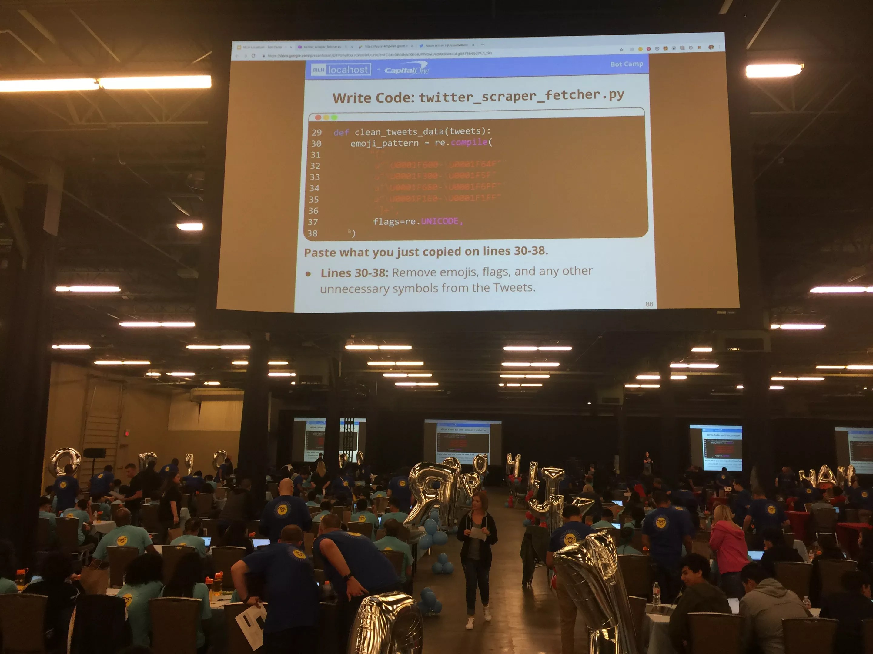 Students were broken into groups of four to five kids each, with a volunteer moderator to help them with their coding lesson. A lecturer stood at the front of the room and showed them each step of the process to create and code their AI bots line by line on large projection screens hanging throughout the hotel’s convention room.