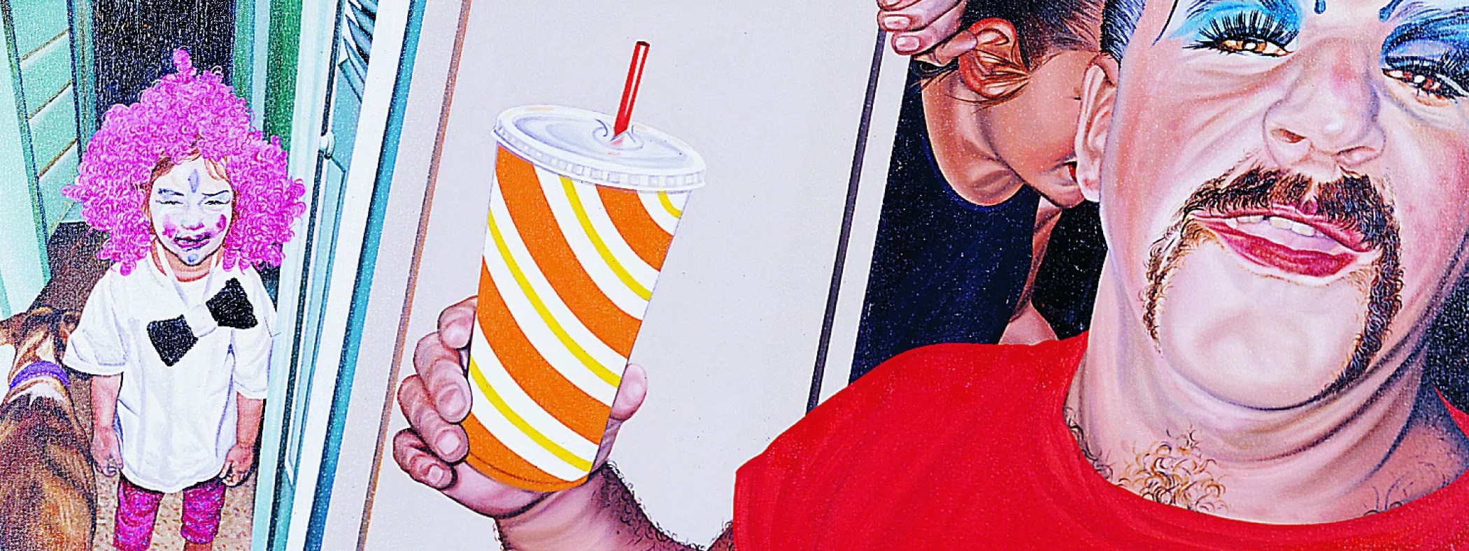 The painter’s source material comes from the parties and events that she attends, where she can usually be found lifting a camera high over people’s heads to capture the essence of a moment from above. From the thousands of photographs she takes at parties, she creates her large, colorful, vivacious paintings.