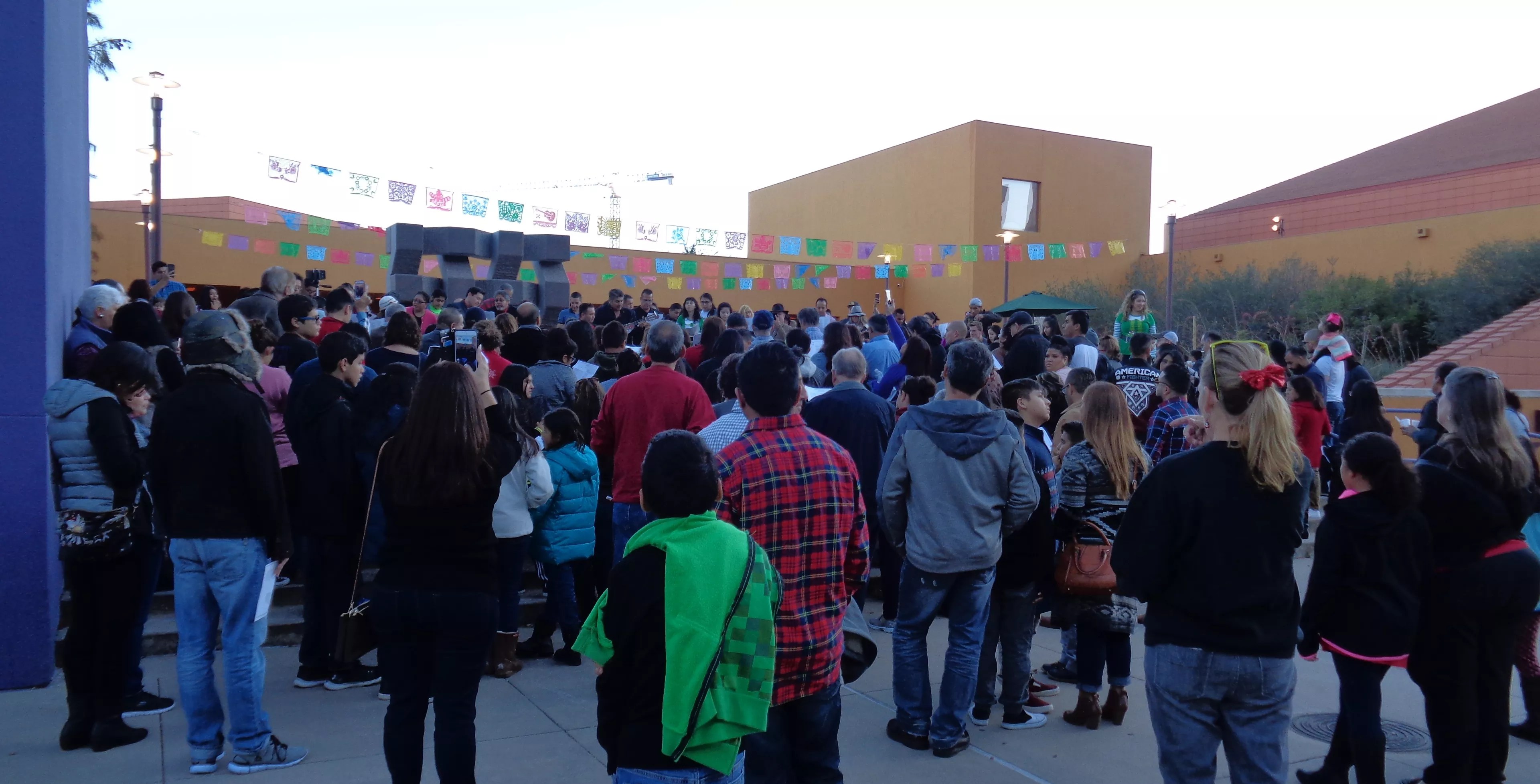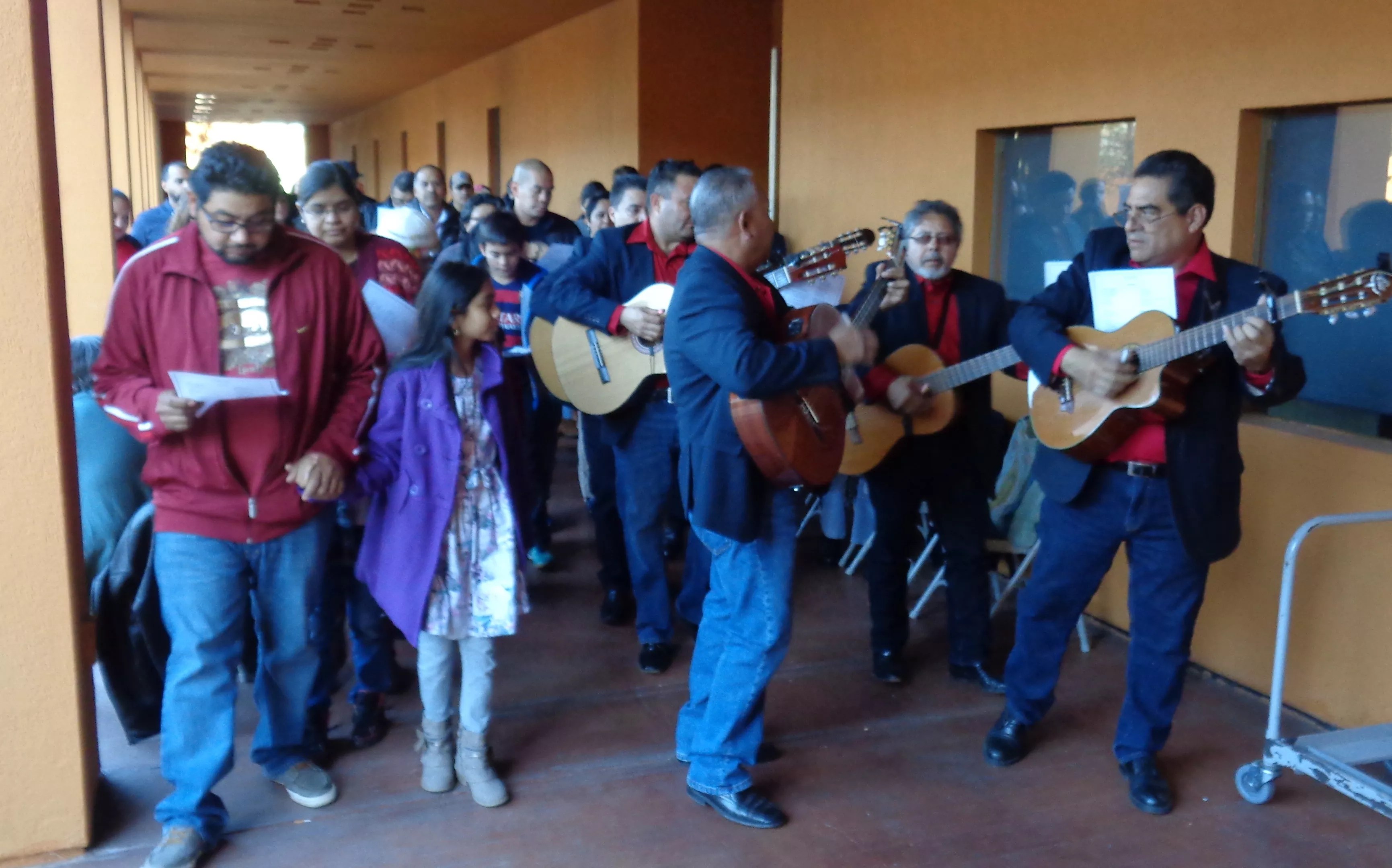 At every stop, attendants sang Spanish posada songs. Those who’ve attended posadas for decades have them memorized. Those new to the tradition read from lyric sheets. The procession concluded in the center’s plaza, where the Rondalla played more festive Spanish songs that inspired a few children and couples to dance.