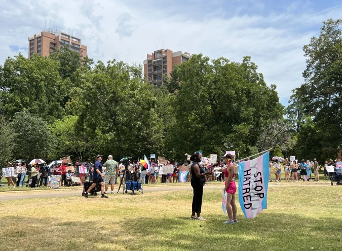 Demonstrators at Texas Woman’s University chanted: “Greg Abbott, you can’t hide / We charge you with genocide.”