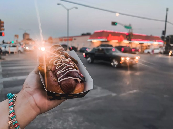 On Sunday evenings, lowrider clubs show off their vintage cars and big sounds along Jefferson Avenue. It’s where we discovered Olidogs grilling LA-style dogs.