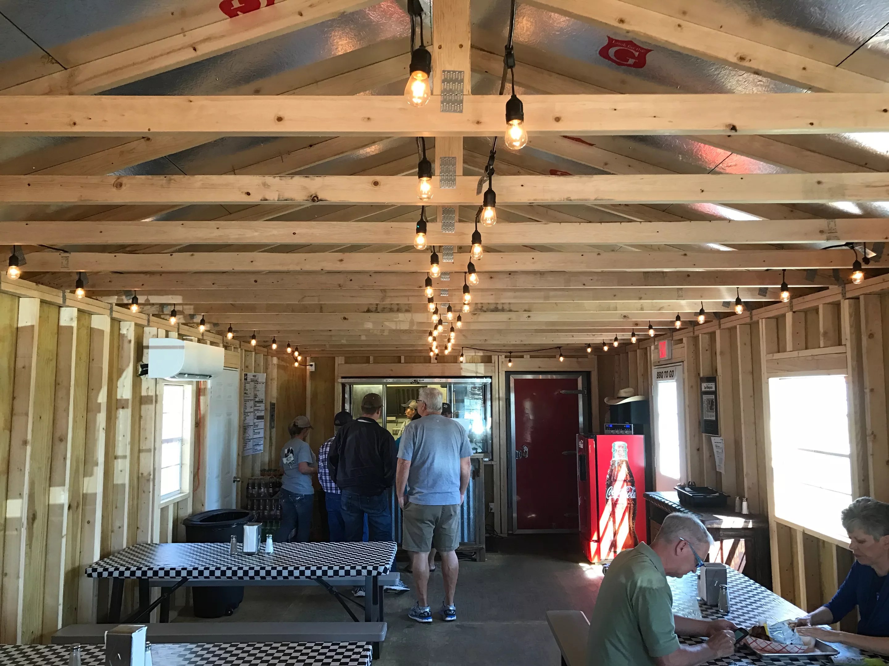 Inside is extremely simple. A window unit air conditioner hums quietly, and no expense has been made on non-barbecue items like drywall or ceilings. Strings of lights are woven through the open rafters down the length of the interior, and five plastic and metal picnic tables with checkerboard vinyl make up the seating. Customers order at a small counter in the back.