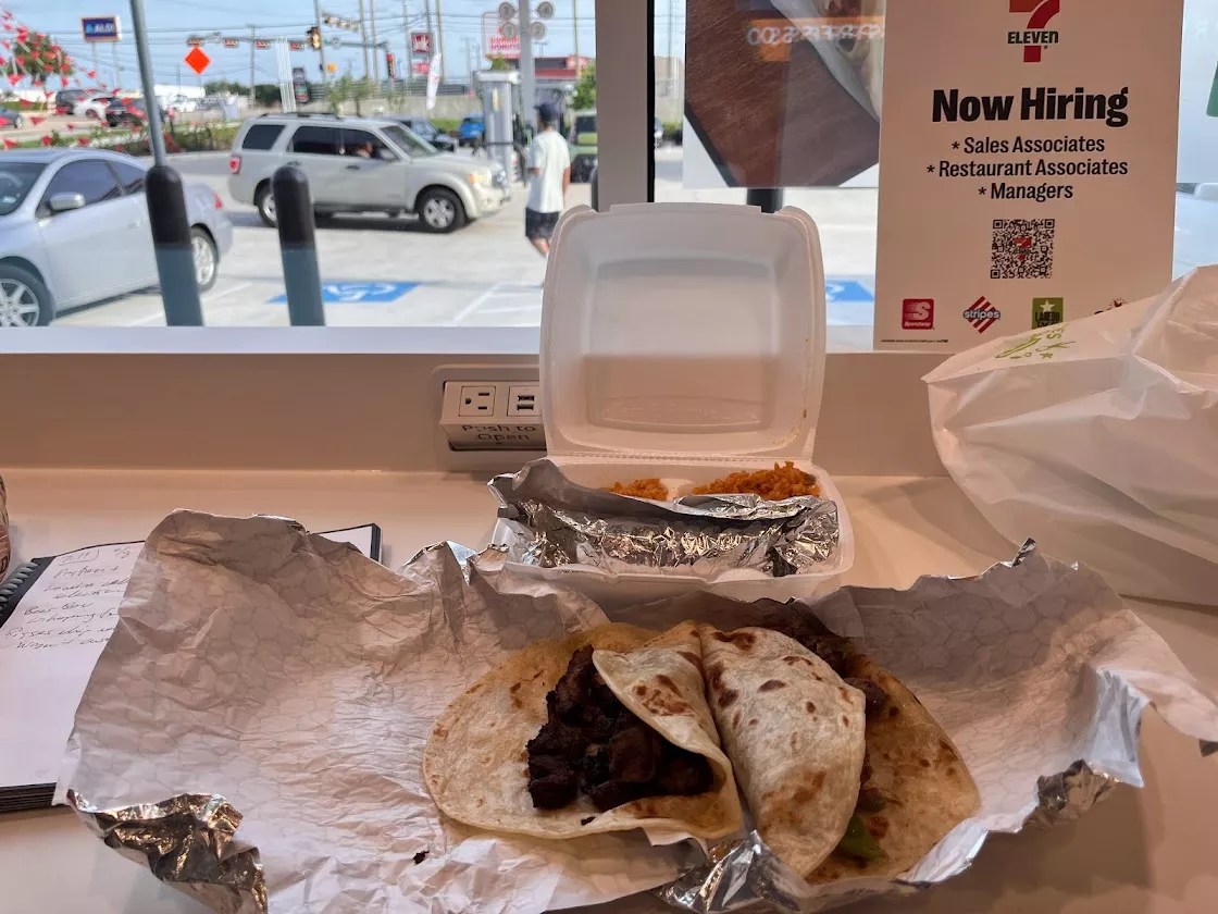 This super-sized version of a 7-Eleven convenience store contains all the usual aisles and displays of snack foods, sodas and Slurpees, but the extra space is dedicated to a beer and wine selection, an expanded array of cold treat dispensers and the newest location for the Laredo Taco Company.