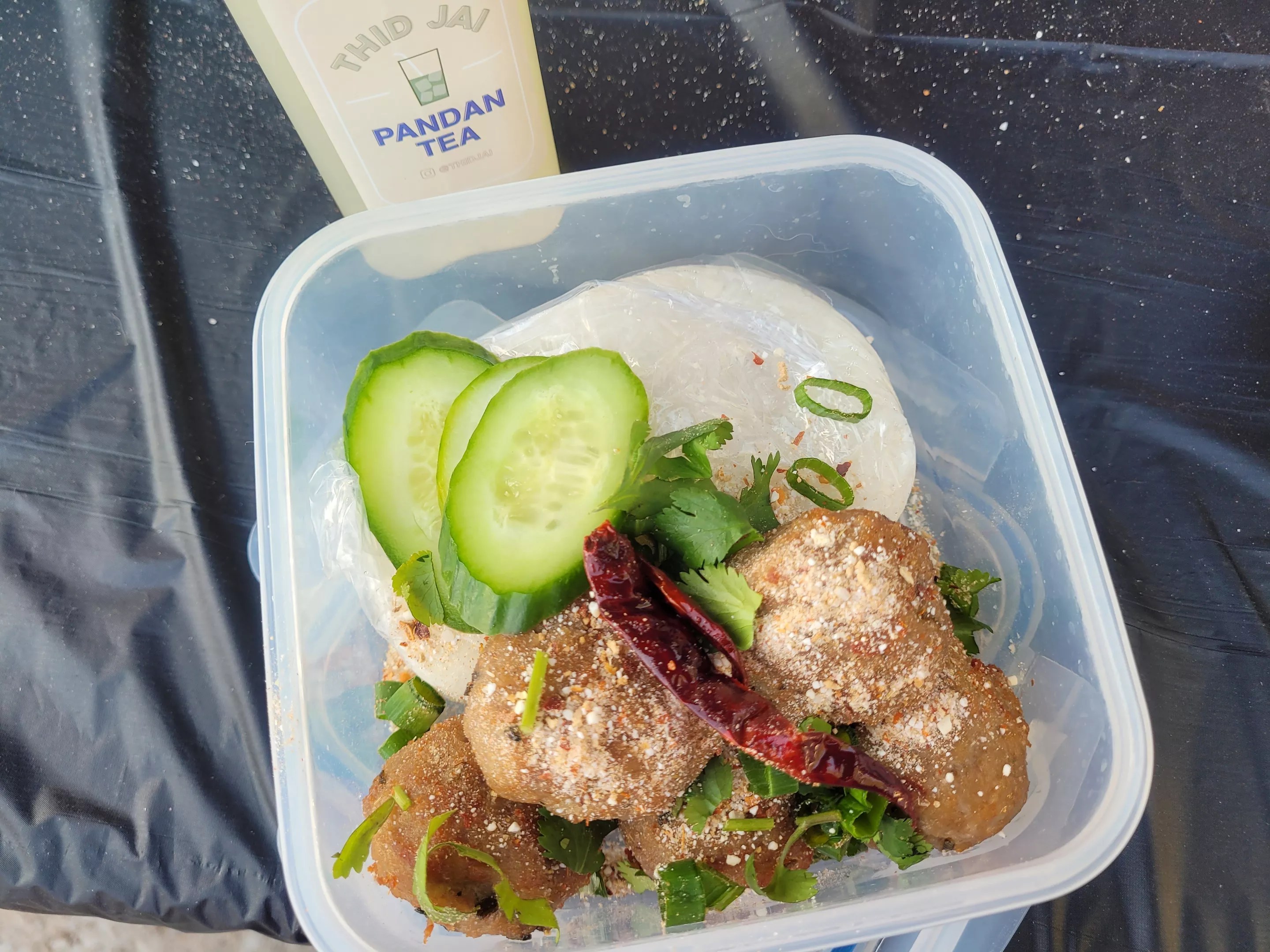 Larb balls and pandan tea from Thid Jai.