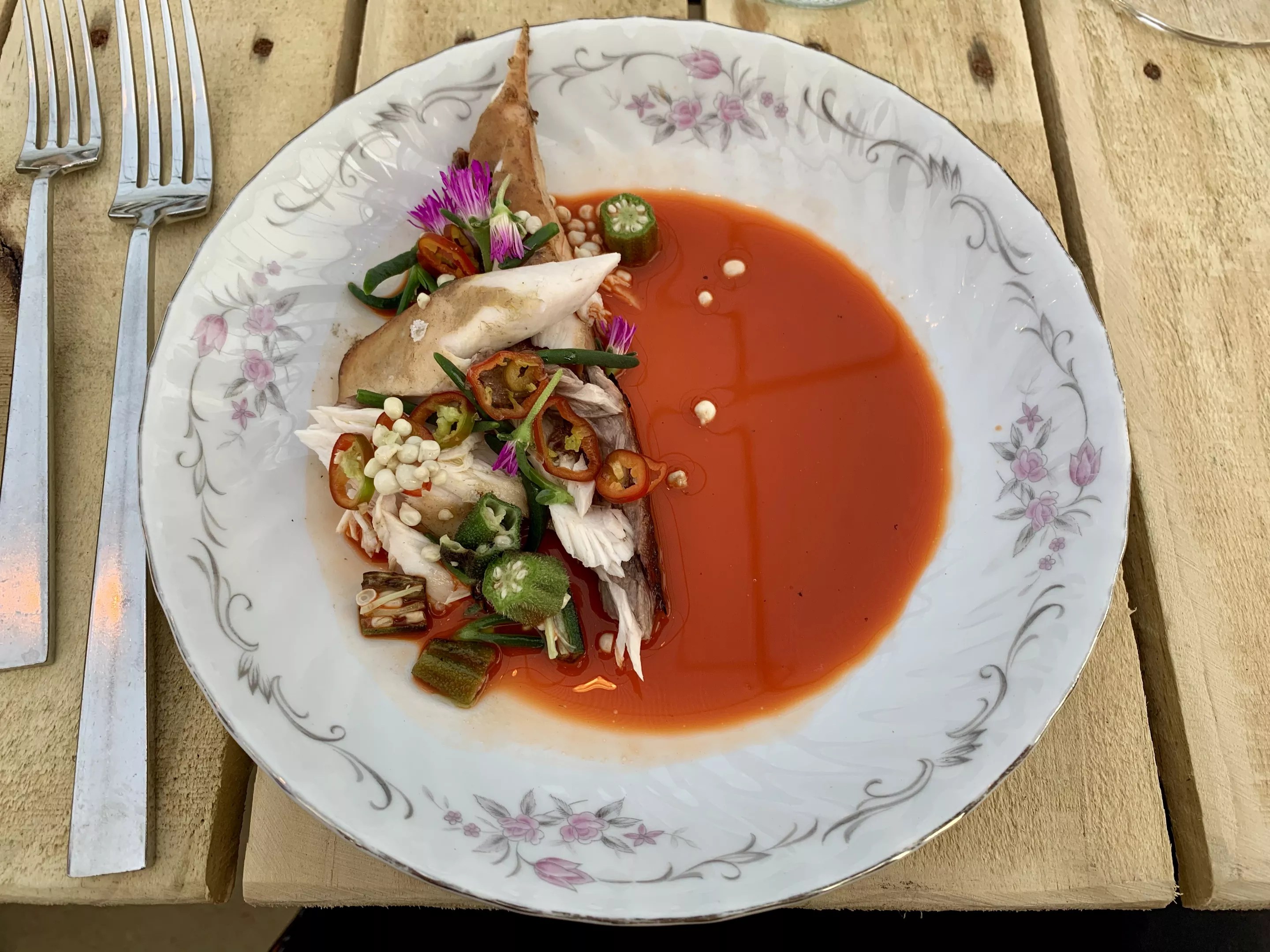 Smoked Hiramasa kingfish with Comeback Creek Farm late season pepper water (Note: this is not aguachile)