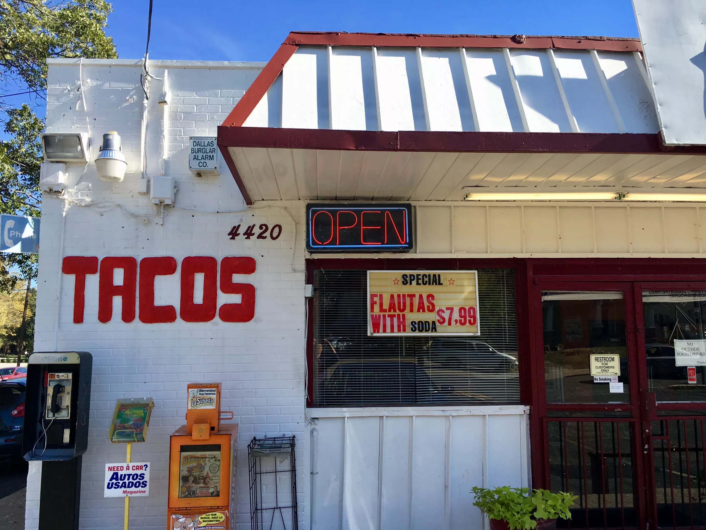 On the corner of Carroll Avenue and Worth Street, hiding in plain sight in Peak’s Suburban Addition, there’s a paprika-red sign that reads “TACOS” in all caps. Under it, as you swing your car in off the Oregon-trail bumpy roads of Carroll Avenue, you’ll find what’s probably one of the last few pay-phones in the city. Flautas are advertised in balloon red, with soda, for a penny less than 8 bucks. The door clangs as you walk in, and there’s a good chance you’ll find Roldan behind the counter. She’s ready with a pen and a cup for the soup.