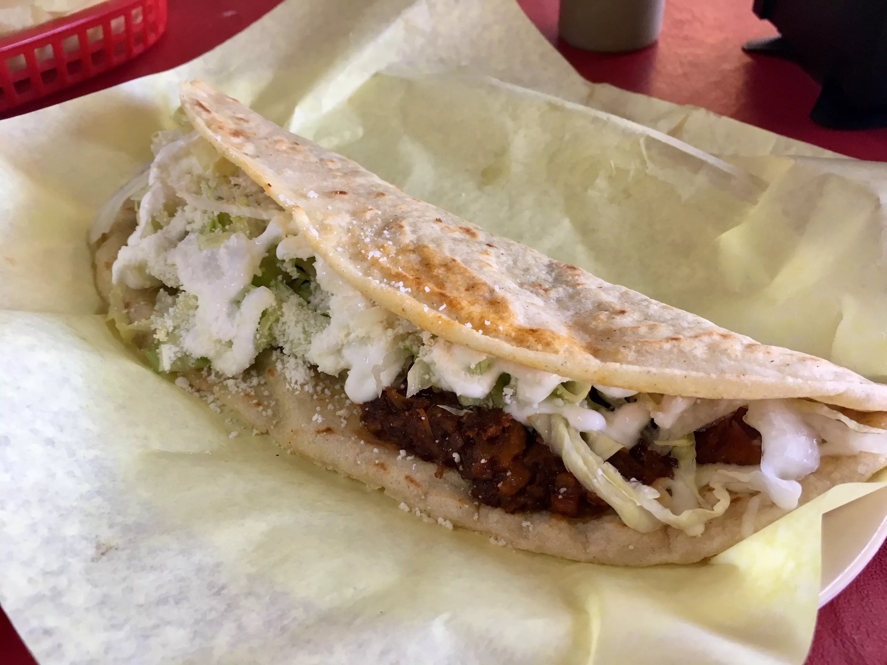 I order the quesadilla first this time – it’s the dish you’ll spot on the far right panel of the menu, not the more Tex-Mex quesadilla you’ll find next to the burritos. Not long after, seconds really, a homemade tortilla is pressed into the griddle with a flat spatula. The cook puts some weight into it, crisping it all over, charring the thicker parts of the tortilla’s edges bronze. He seals in tender and saucy pork, a zag of cotija, shredded lettuce and plucks of crema. It’s Aca Las Tortas’ autumnal cure for everything. It’s mighty street food, eaten with a plastic knife and fork that bend as they dive into the quesadilla. Do not forget to fire on some of Roldan’s homemade salsa.