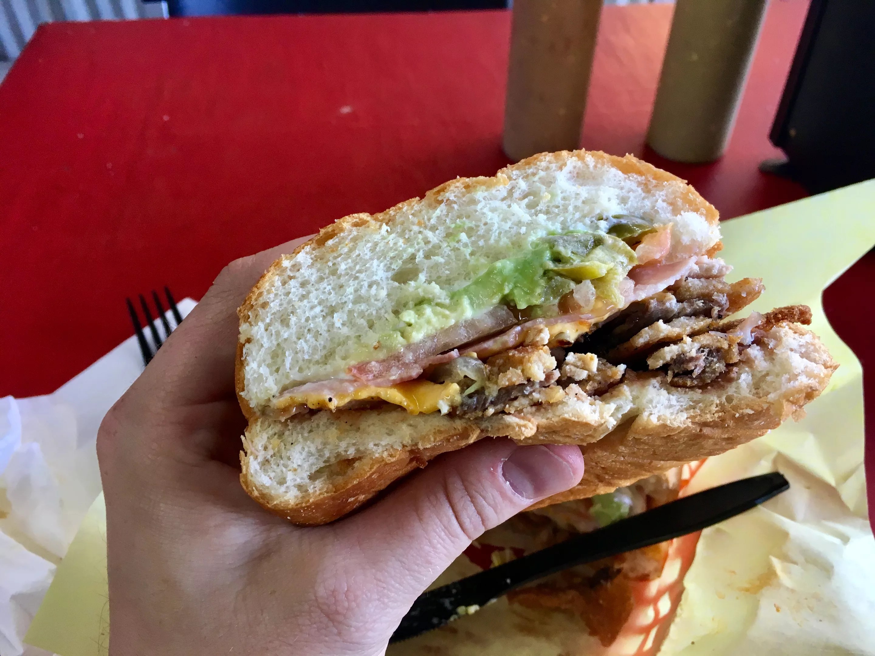 The Tortuga torta with pounded-thin, breaded steak, pork loin, ham, mayo, mustard, American cheese, guacamole and grilled onions is .99.