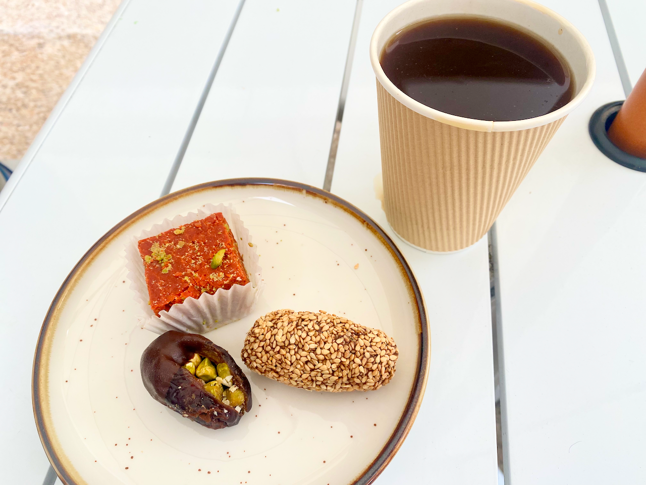 Yemeni coffee, along with a harissa confection and two stuffed dates.