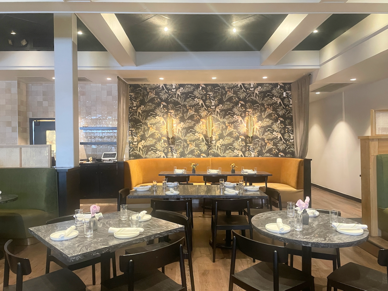 The indoor dining area of Au Troisième has a combination of booths and tables accented with dark-colored velvet and gray, beige and gold accents throughout. There is a full bar with about eight seats and an outdoor patio. The wallpaper throughout the restaurant is filled with monkeys, lions and leopards, oh my! The bathrooms are worth checking out, even if it’s just to see the vodka-drinking, Cuban-smoking monkey wallpaper.