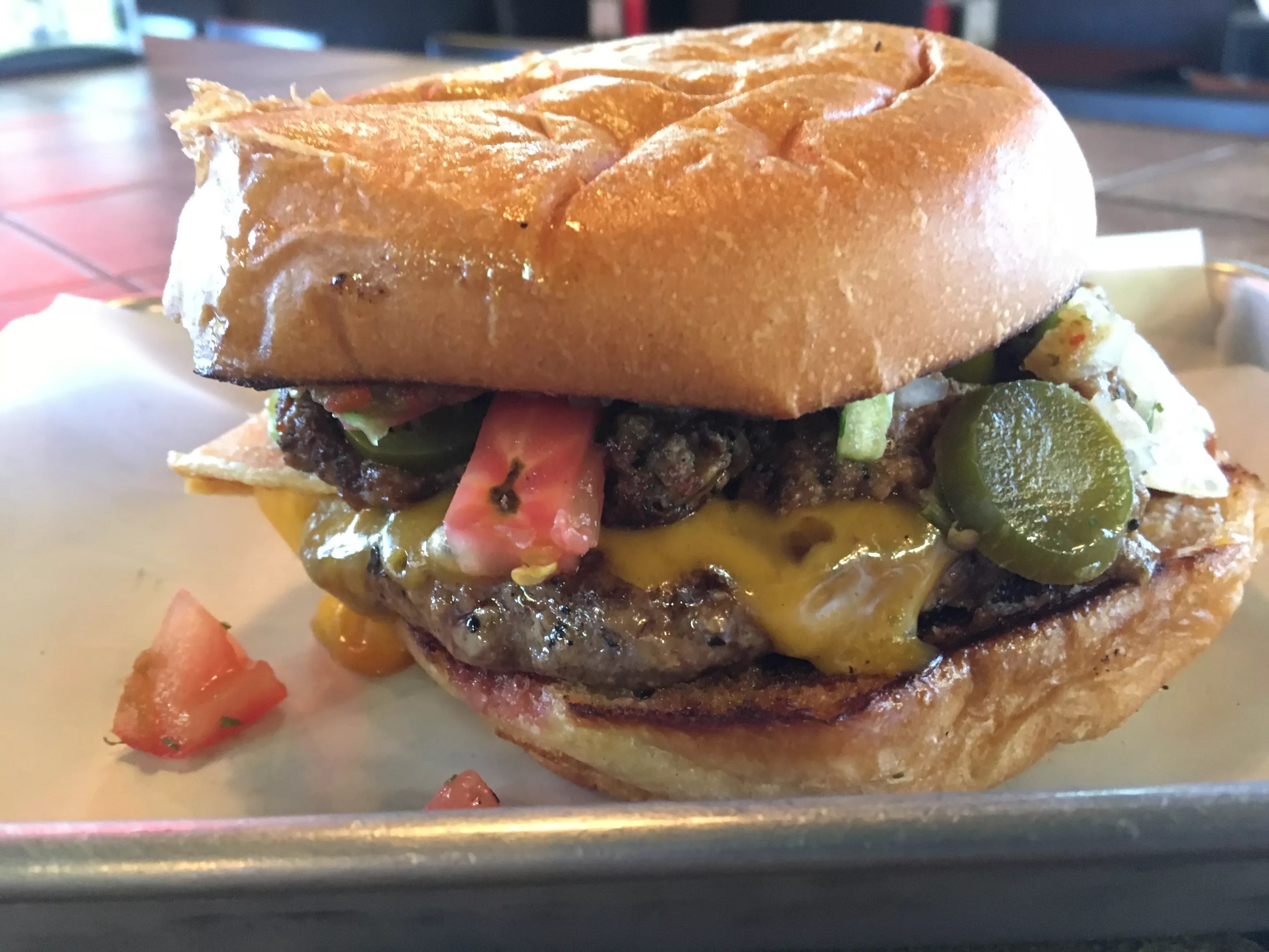 You may have a few questions as the Santana, one of Blues Burgers’ new burgers, arrives on its metal tray. Those questions likely include: “Why are they doing this to me?” or “What have you done?” or “Am I going to be OK?” Why so many questions? Because you’ve ordered an Angus beef burger topped with a cheese-stuffed enchilada and smothered in chili con carne, pico de gallo and a handful of jalapeños. The spice and the questions gradually increase like an orchestra tuning before a concert, yet somehow, it’s delicious.