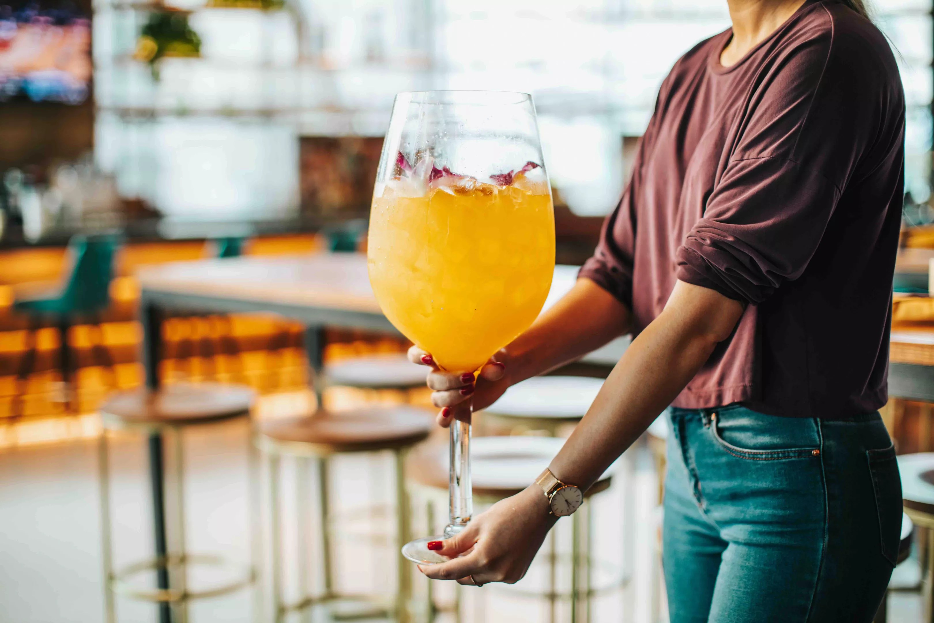 These glasses, the size of a small child, are plainly visible on tables throughout the huge restaurant, drawing curious looks from those who just sat down, along with people who welcome them to their table with no shame.