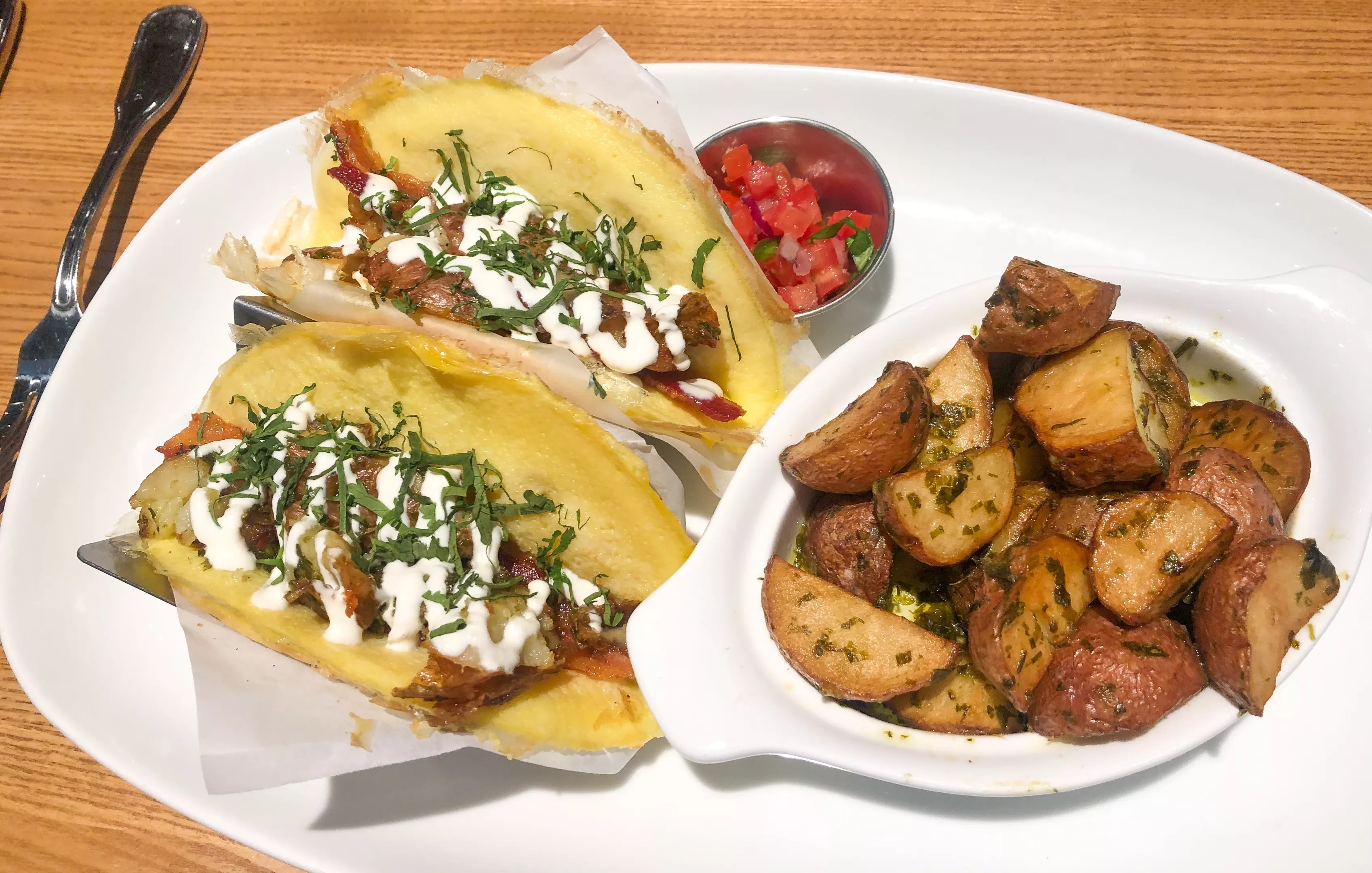 The breakfast tacos are basic in flavor, but not in presentation: Instead of a tortilla, scrambled eggs are shaped into a vehicle for carrying bacon and cheddar ($13). Herb-roasted redskin potatoes are fine, too, complementing as a slightly crisp starch.