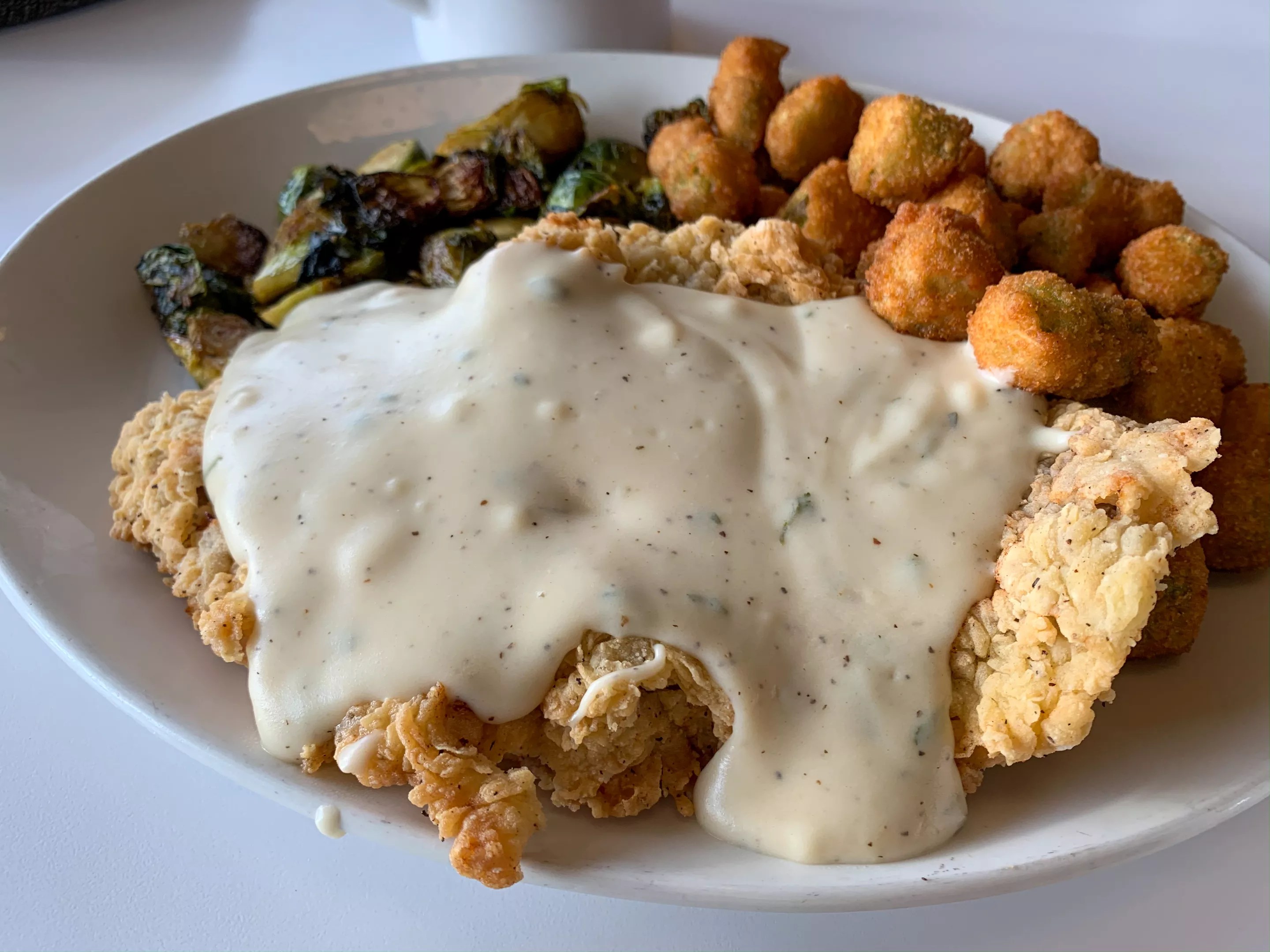 This is only served on the weekends until 3 p.m. Boneless chicken breast is pounded and fried just like the CFS that’s so wonderful, with a flaky and well-seasoned batter; two of those crazy-fresh eggs that are actually perfectly cooked to medium are on top; below are sweet onions and a corn muffin. The corn muffin had us less than excited, but once you get that sweetness among everything else, you understand how it works. This comes with a Tabasco hollandaise — but you can also get it with gravy. (And if you’re like some of us who walk in the door here thinking of CFS, you might as well.) The gravy works wonderfully with this plate; either sauce offers a savory quality, balancing the sweetness from the muffin and onions.