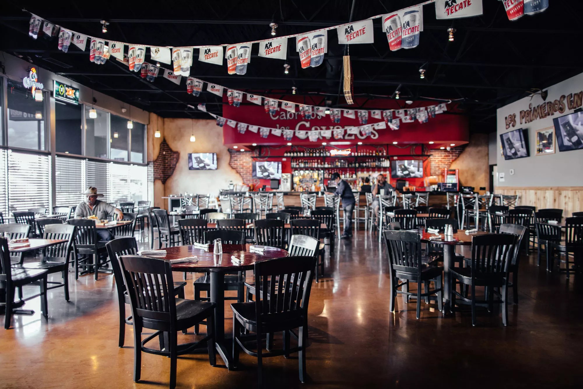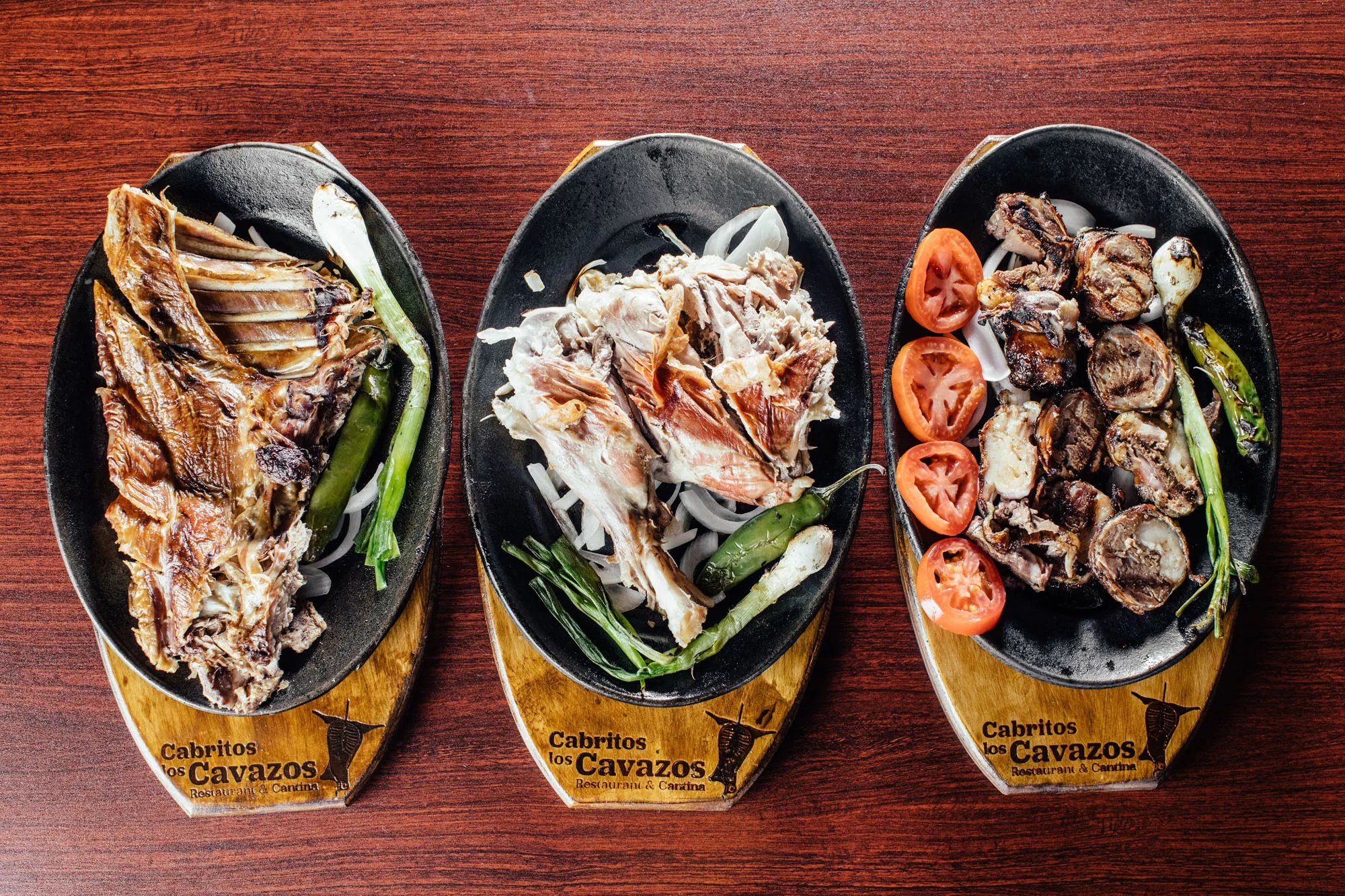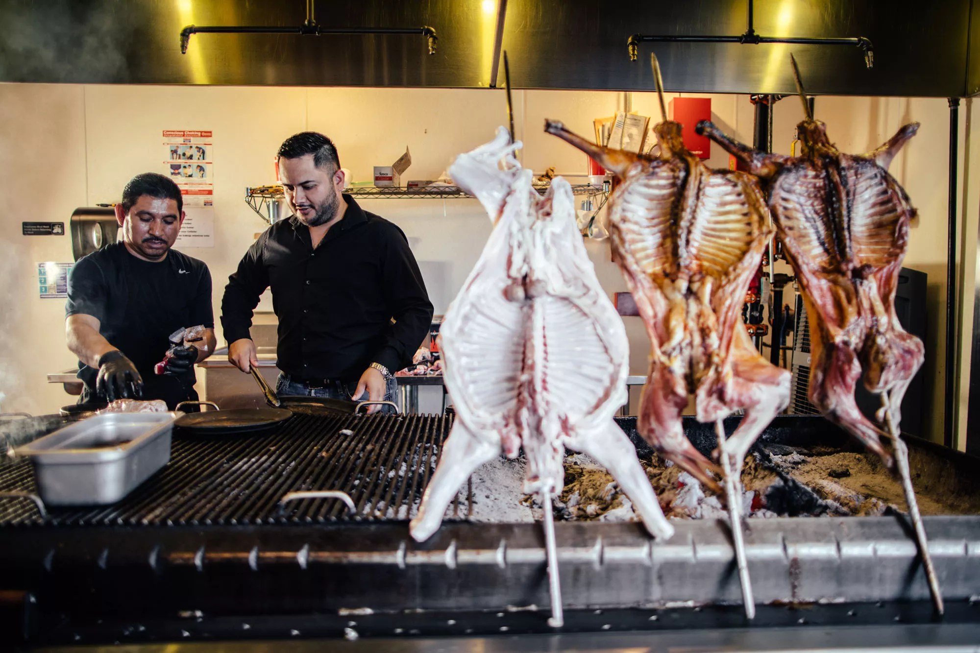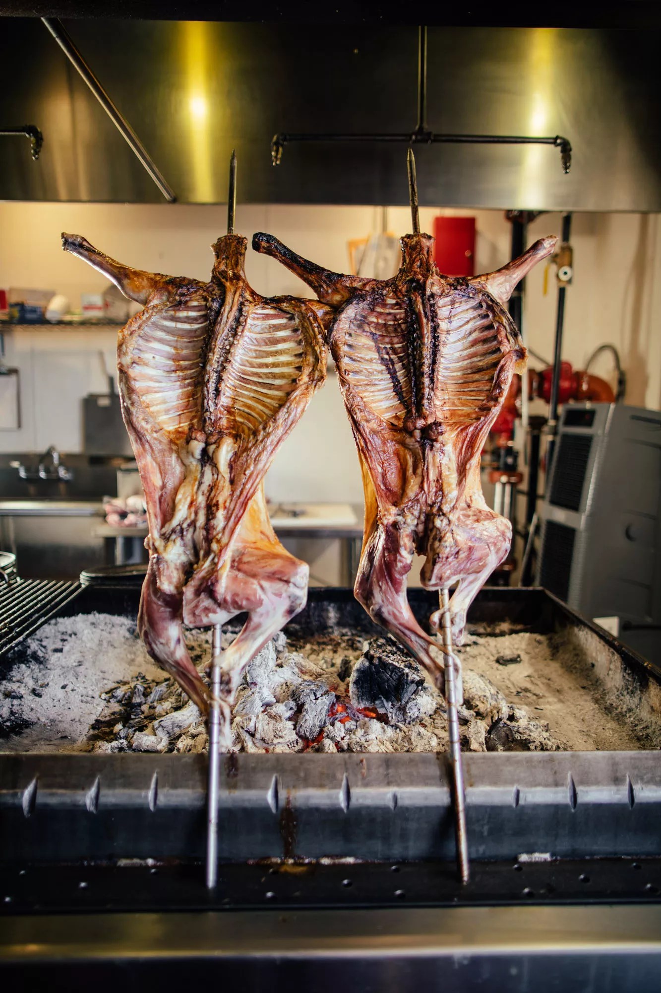 Goat carcasses unfurl over the grill like flags in the breeze. It’s a massive grill, at least 3 feet across and as long as a small car, not quite an earthen pit in a backyard but as close as you can get indoors without offending the health inspector. Part of the pit is covered with grill bars, for steaks and to heat up fajita platters, but the whole goats tower over smoldering logs and chips of mesquite wood.