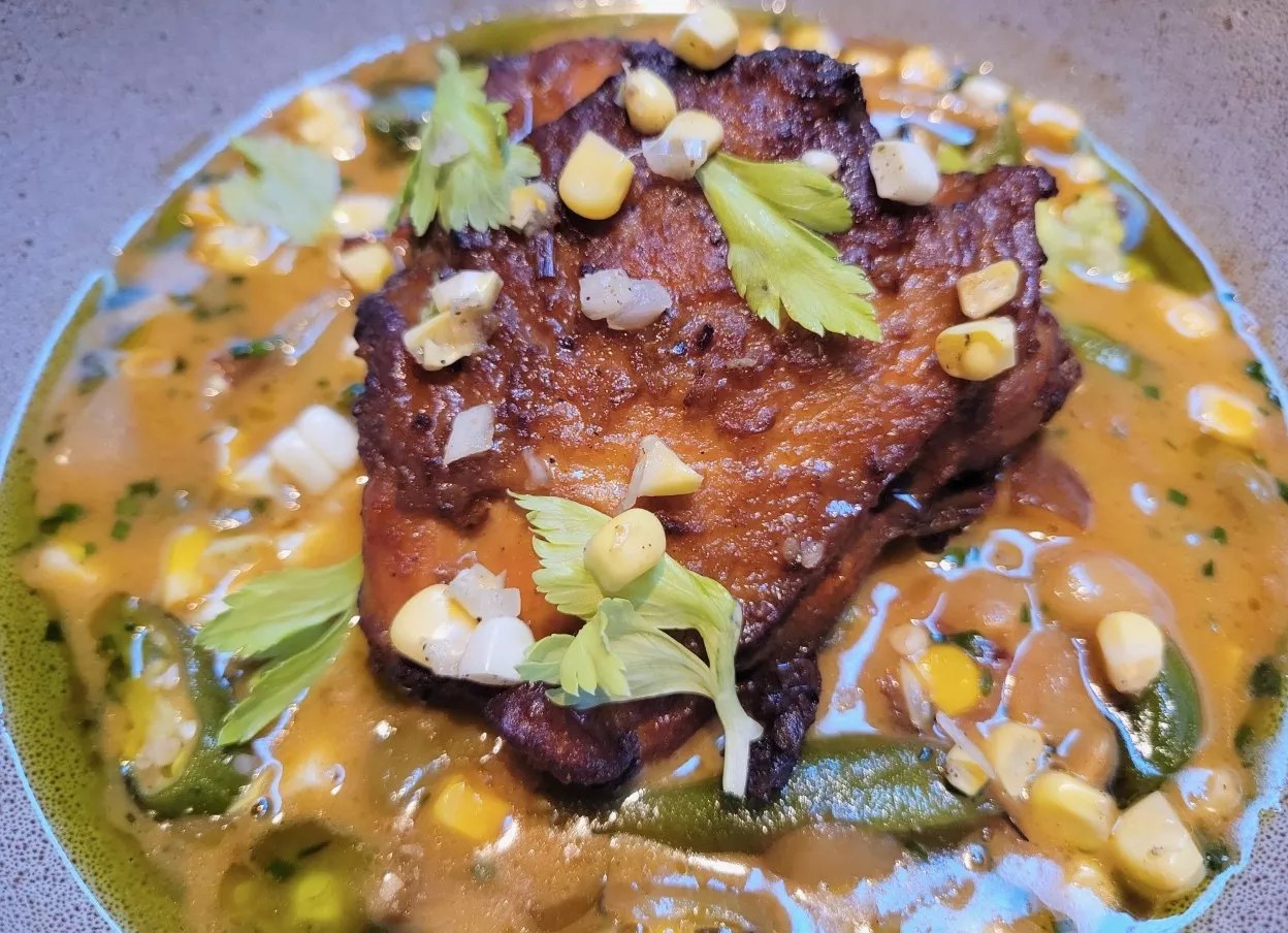 This new innovative plate is a complete kaleidoscope of gorgeous flavors. It’s made from several vegetables like butter beans, raw corn, pickled corn, charred okra and stewed tomatoes. When you see the miso, you may think it will be a subtle Japanese-infused flavor until you get an old country throat punch of Southern flavors of soulful proportions.